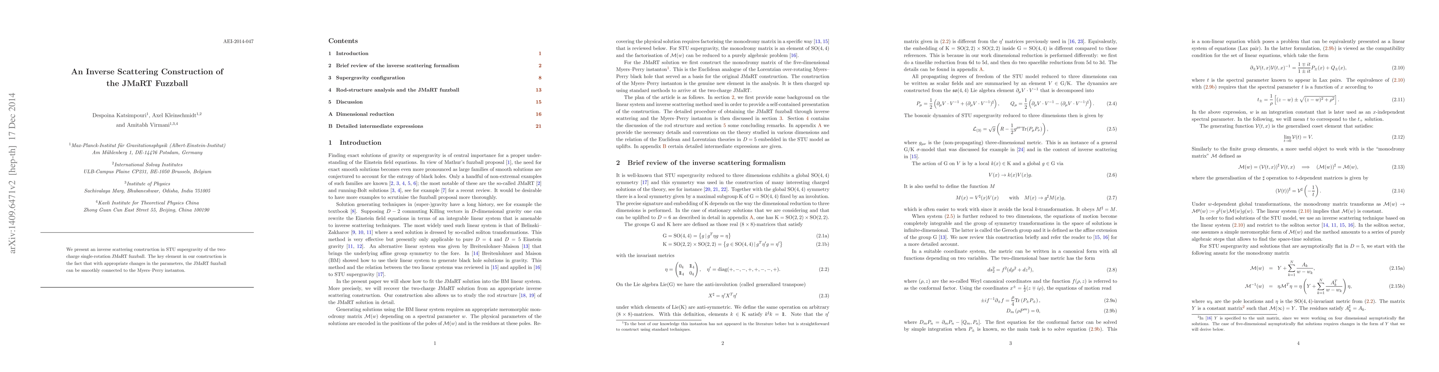 Summary: This paper constructs the JMaRT fuzzball in STU supergravity using inverse scattering techniques, demonstrating that it can be smoothly linked to the Myers-Perry instanton through parameter adjustments. The method provides insights into the structure of black holes in string theory.
