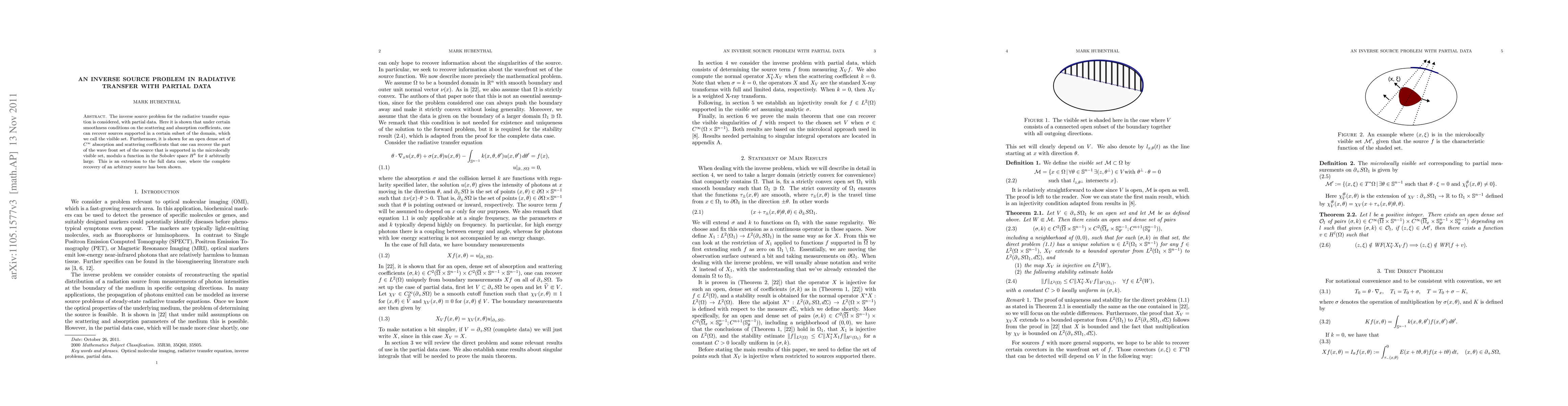 The inverse source problem for the radiative transfer equation is considered, with partial data. Here it is shown that under certain smoothness conditions on the scattering and absorption coefficients, one can recover sources supported in a certain subset of the domain, which we call the visible set. Furthermore, it is shown for an open dense set of $C^{\infty}$ absorption and scattering coefficients that one can recover the part of the wave front set of the source that is supported in the microlocally visible set, modulo a function in the Sobolev space $H^{k}$ for $k$ arbitrarily large. This is an extension to the full data case, which is considered in \cite{inversesource}.