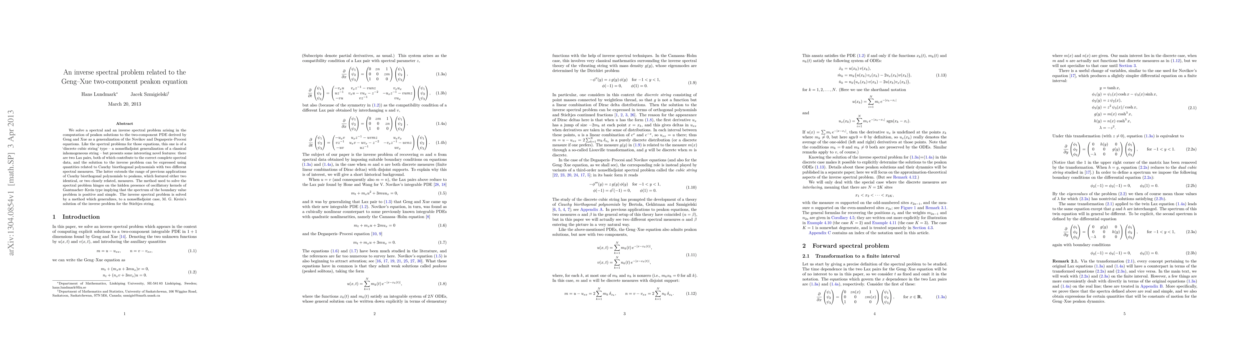 We solve a spectral and an inverse spectral problem arising in the computation of peakon solutions to the two-component PDE derived by Geng and Xue as a generalization of the Novikov and Degasperis-Procesi equations. Like the spectral problems for those equations, this one is of a 'discrete cubic string' type -- a nonselfadjoint generalization of a classical inhomogeneous string -- but presents some interesting novel features: there are two Lax pairs, both of which contribute to the correct complete spectral data, and the solution to the inverse problem can be expressed using quantities related to Cauchy biorthogonal polynomials with two different spectral measures. The latter extends the range of previous applications of Cauchy biorthogonal polynomials to peakons, which featured either two identical, or two closely related, measures. The method used to solve the spectral problem hinges on the hidden presence of oscillatory kernels of Gantmacher-Krein type implying that the spectrum of the boundary value problem is positive and simple. The inverse spectral problem is solved by a method which generalizes, to a nonselfadjoint case, M. G. Krein's solution of the inverse problem for the Stieltjes string.