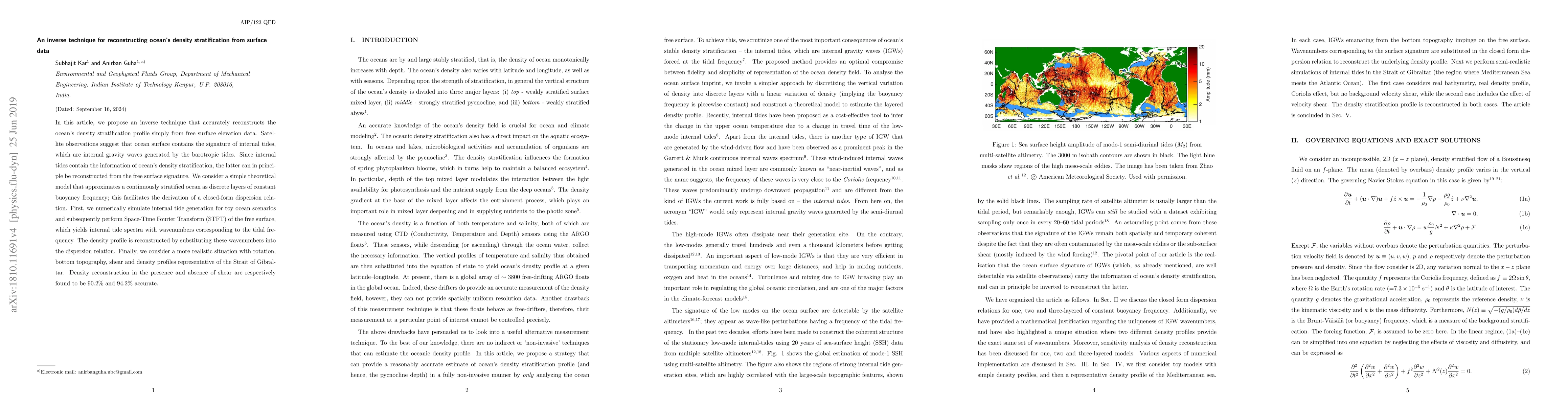 This paper proposes an inverse technique to reconstruct ocean density stratification profiles from surface elevation data using satellite observations of internal tides. The method involves simulating internal tides, applying a Space-Time Fourier Transform, and using a derived dispersion relation to reconstruct density profiles, achieving accuracies of 90.2% and 94.2% under different conditions.