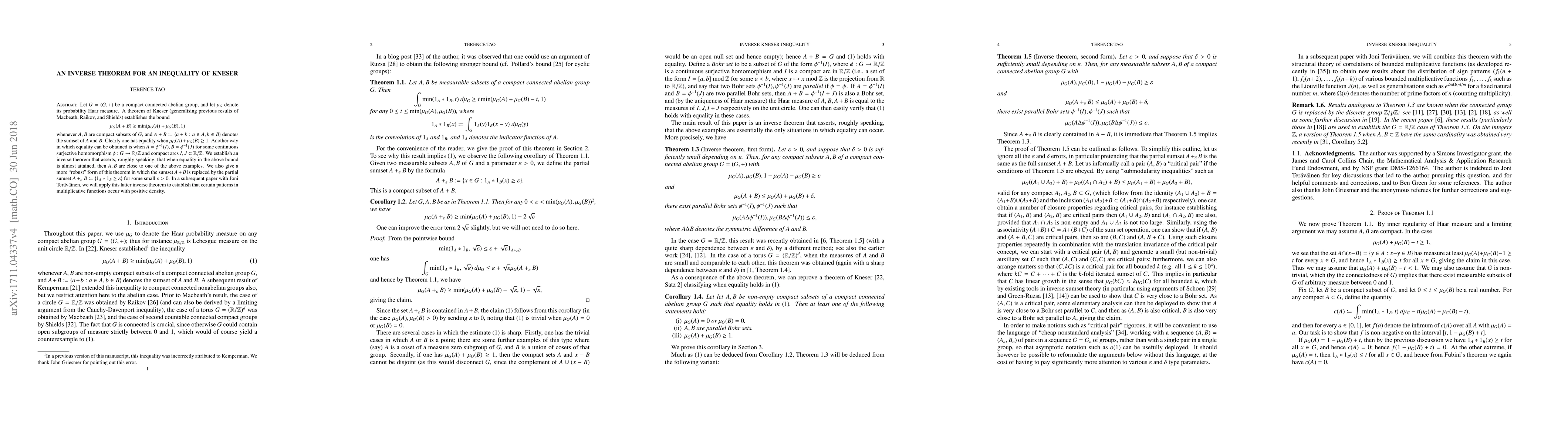 Let $G = (G,+)$ be a compact connected abelian group, and let $\mu_G$ denote its probability Haar measure. A theorem of Kneser (generalising previous results of Macbeath and Raikov) establishes the bound $$ \mu_G(A + B) \geq \min( \mu_G(A)+\mu_G(B), 1 ) $$ whenever $A,B$ are compact subsets of $G$, and $A+B := \{ a+b: a \in A, b \in B \}$ denotes the sumset of $A$ and $B$. Clearly one has equality when $\mu_G(A)+\mu_G(B) \geq 1$. Another way in which equality can be obtained is when $A = \phi^{-1}(I), B = \phi^{-1}(J)$ for some continuous surjective homomorphism $\phi: G \to {\bf R}/{\bf Z}$ and compact arcs $I,J \subset {\bf R}/{\bf Z}$. We establish an inverse theorem that asserts, roughly speaking, that when equality in the above bound is almost attained, then $A,B$ are close to one of the above examples. We also give a more "robust" form of this theorem in which the sumset $A+B$ is replaced by the partial sumset $A +_\varepsilon B :=\{ 1_A * 1_B \geq \varepsilon \}$ for some small $\varepsilon >0$. In a subsequent paper with Joni Ter\"av\"ainen, we will apply this latter inverse theorem to establish that certain patterns in multiplicative functions occur with positive density.