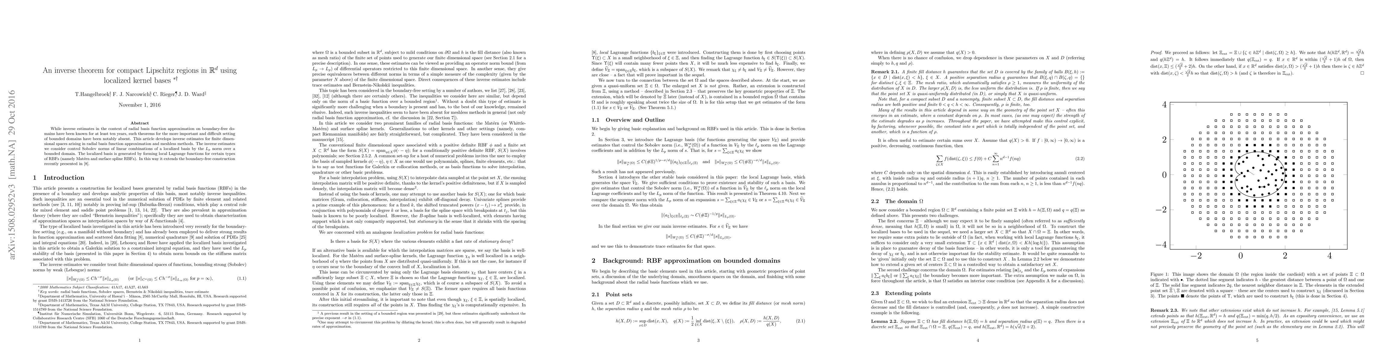 While inverse estimates in the context of radial basis function approximation on boundary-free domains have been known for at least ten years, such theorems for the more important and difficult setting of bounded domains have been notably absent. This article develops inverse estimates for finite dimensional spaces arising in radial basis function approximation and meshless methods. The inverse estimates we consider control Sobolev norms of linear combinations of a localized basis by the $L_p$ norm over a bounded domain. The localized basis is generated by forming local Lagrange functions for certain types of RBFs (namely Mat\'ern and surface spline RBFs). In this way it extends the boundary-free construction of Fuselier, Hangelbroek, Narcowich, Ward and Wright.