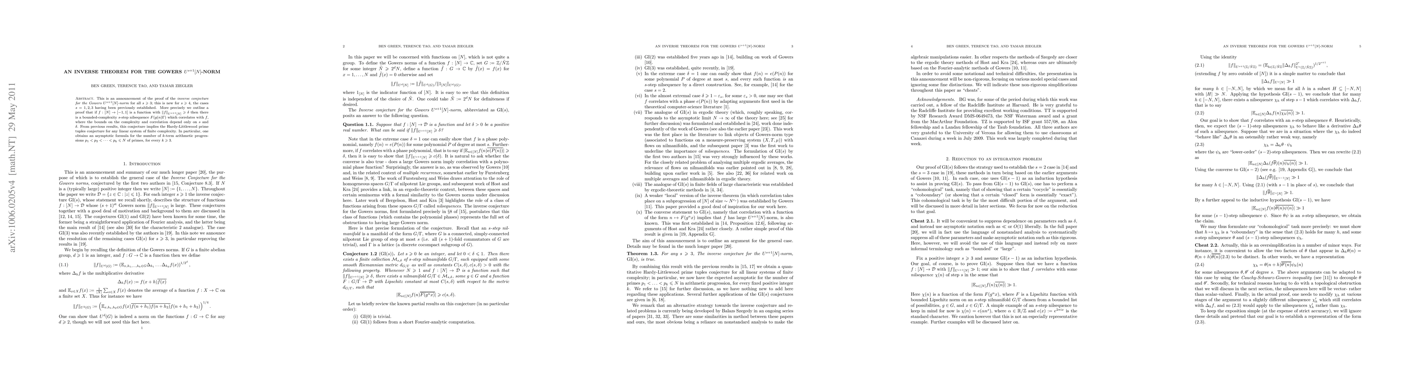 This paper announces the proof of the inverse conjecture for the Gowers U^{s+1}[N]-norm for s >= 3, particularly for s >= 4, establishing new results. The proof implies the Hardy-Littlewood prime tuples conjecture and provides an asymptotic formula for the number of k-term arithmetic progressions of primes for k >= 3.