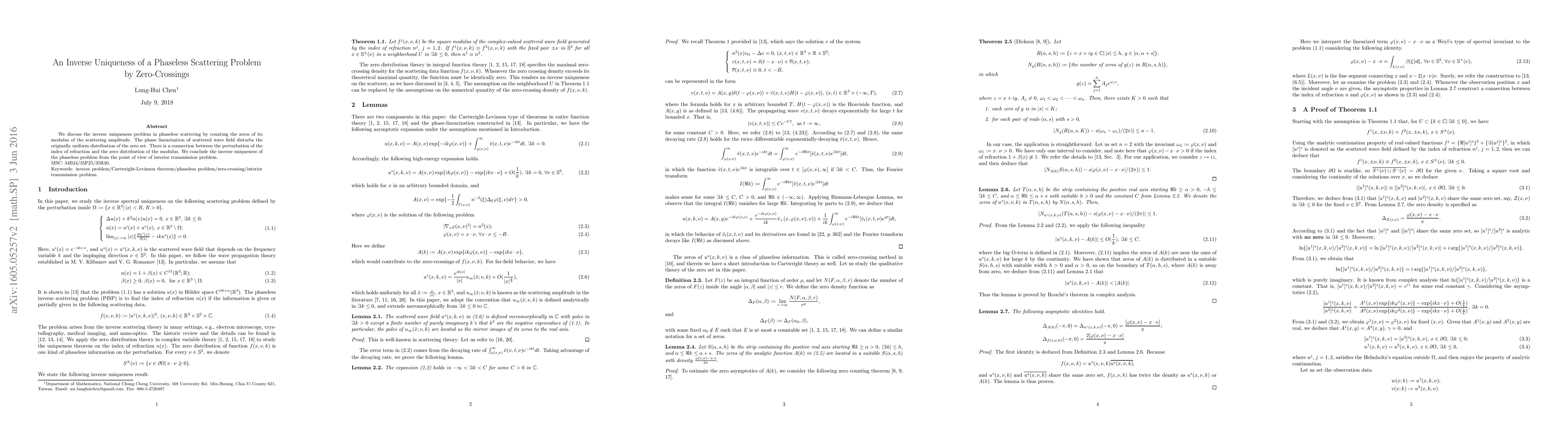 This paper explores the inverse uniqueness in phaseless scattering problems by analyzing the zero-crossings of the scattering amplitude's modulus. It reveals a relationship between the perturbation of the index of refraction and the zero distribution, concluding the inverse uniqueness from the perspective of the interior transmission problem.