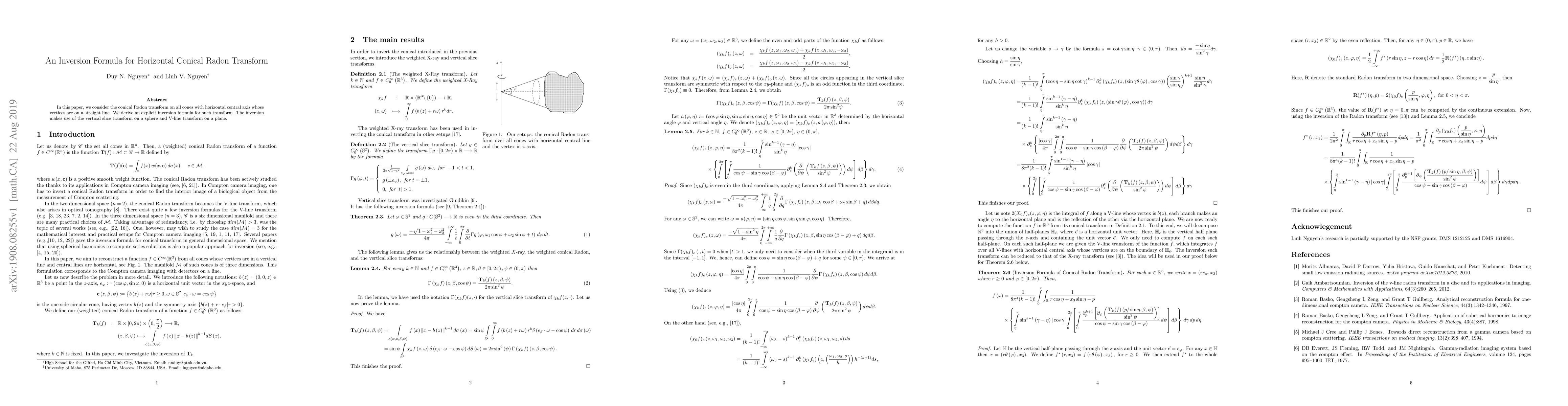 This paper derives an explicit inversion formula for the horizontal conical Radon transform, utilizing the vertical slice transform on a sphere and the V-line transform on a plane. The focus is on cones with horizontal central axes whose vertices lie on a straight line.