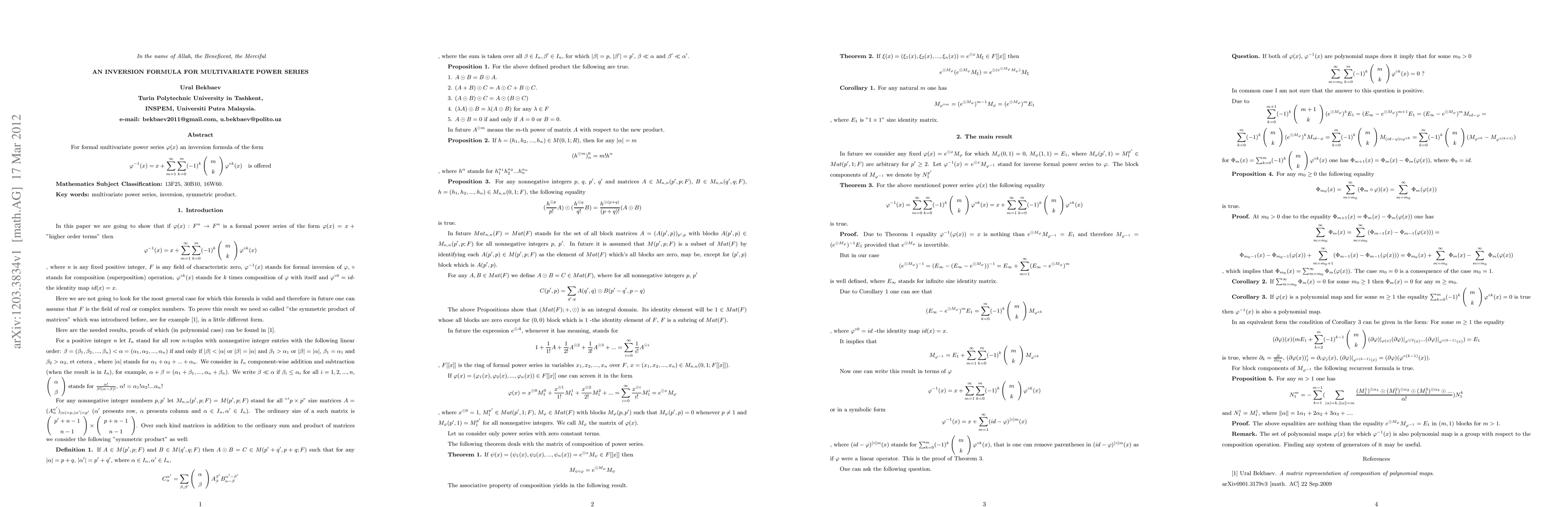 This paper presents an inversion formula for formal multivariate power series, providing a method to express the inverse series $\varphi^{-1}(x)$ in terms of the original series $\varphi(x)$ using a summation involving binomial coefficients and compositions of $\varphi$.