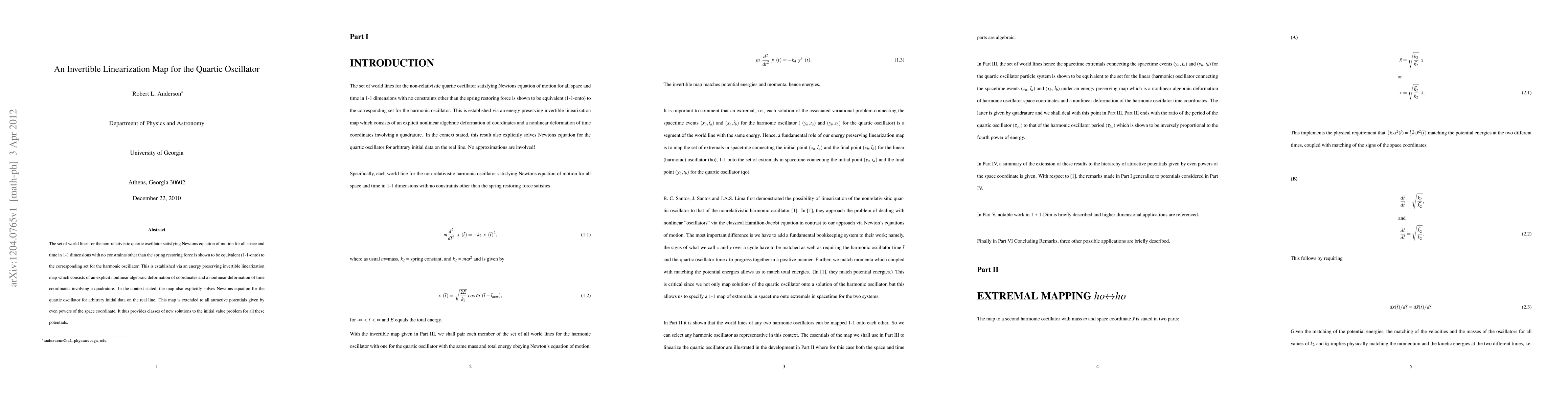 The set of world lines for the non-relativistic quartic oscillator satisfying Newton's equation of motion for all space and time in 1-1 dimensions with no constraints other than the "spring" restoring force is shown to be equivalent (1-1-onto) to the corresponding set for the harmonic oscillator. This is established via an energy preserving invertible linearization map which consists of an explicit nonlinear algebraic deformation of coordinates and a nonlinear deformation of time coordinates involving a quadrature. In the context stated, the map also explicitly solves Newton's equation for the quartic oscillator for arbitrary initial data on the real line. This map is extended to all attractive potentials given by even powers of the space coordinate. It thus provides classes of new solutions to the initial value problem for all these potentials.