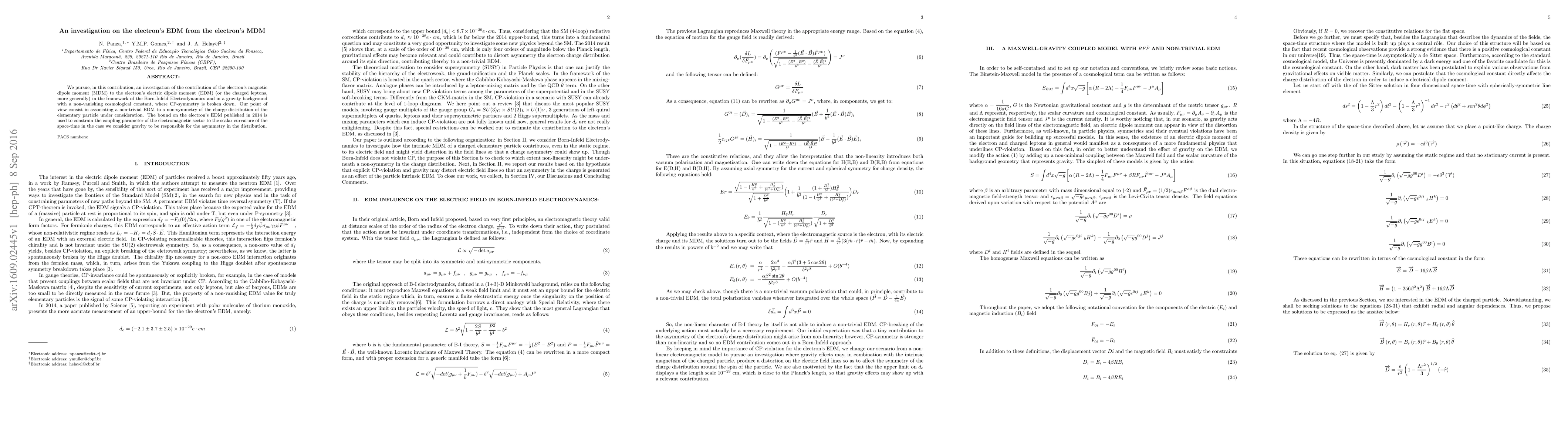We pursue, in this contribution, an investigation of the contribution of the electron's magnetic dipole moment (MDM) to the electron's electric dipole moment (EDM) (or the charged leptons, more generally) in the framework of the Born-Infeld Electrodynamics and in a gravity background with a non-vanishing cosmological constant, where CP-symmetry is broken down. Our point of view consist in associating a non-trivial EDM to a non-symmetry of the charge distribution of the elementary particle under consideration. The bound on the electron's EDM published in 2014 is used to constrain the coupling parameter of the electromagnetic sector to the scalar curvature of the space-time in the case we consider gravity to be responsible for the asymmetry in the distribution.