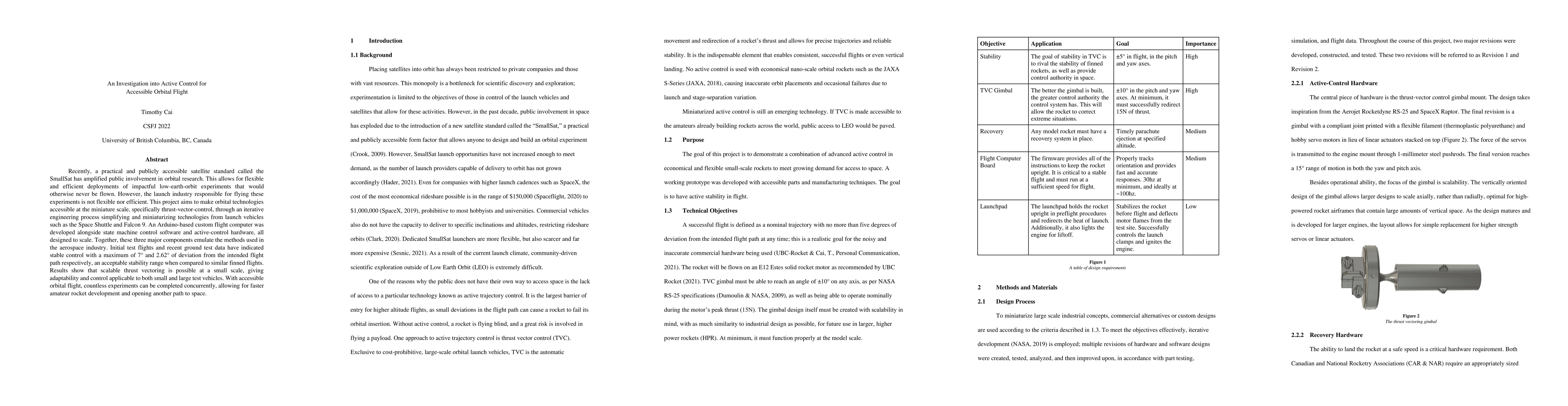 This research investigates the development of an accessible miniature orbital flight system using scalable thrust vectoring technology, demonstrating stable control with minimal deviation through custom flight computer and active-control hardware. The project aims to democratize orbital research by making advanced aerospace technologies feasible for small-scale applications.