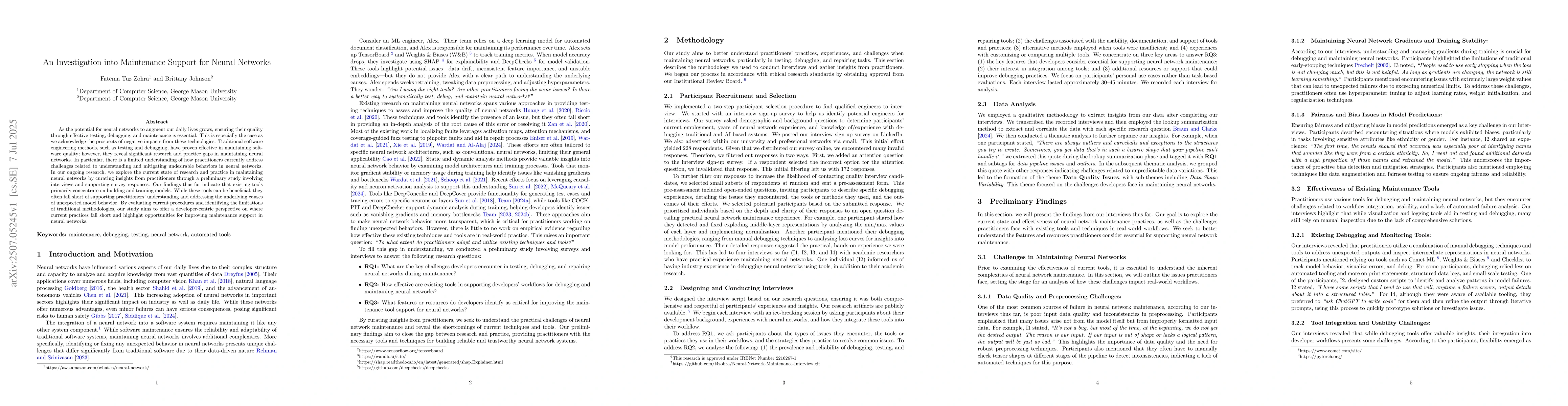 As the potential for neural networks to augment our daily lives grows, ensuring their quality through effective testing, debugging, and maintenance is essential. This is especially the case as we acknowledge the prospects of negative impacts from these technologies. Traditional software engineering methods, such as testing and debugging, have proven effective in maintaining software quality; however, they reveal significant research and practice gaps in maintaining neural networks. In particular, there is a limited understanding of how practitioners currently address challenges related to understanding and mitigating undesirable behaviors in neural networks. In our ongoing research, we explore the current state of research and practice in maintaining neural networks by curating insights from practitioners through a preliminary study involving interviews and supporting survey responses. Our findings thus far indicate that existing tools primarily concentrate on building and training models. While these tools can be beneficial, they often fall short of supporting practitioners' understanding and addressing the underlying causes of unexpected model behavior. By evaluating current procedures and identifying the limitations of traditional methodologies, our study aims to offer a developer-centric perspective on where current practices fall short and highlight opportunities for improving maintenance support in neural networks.
