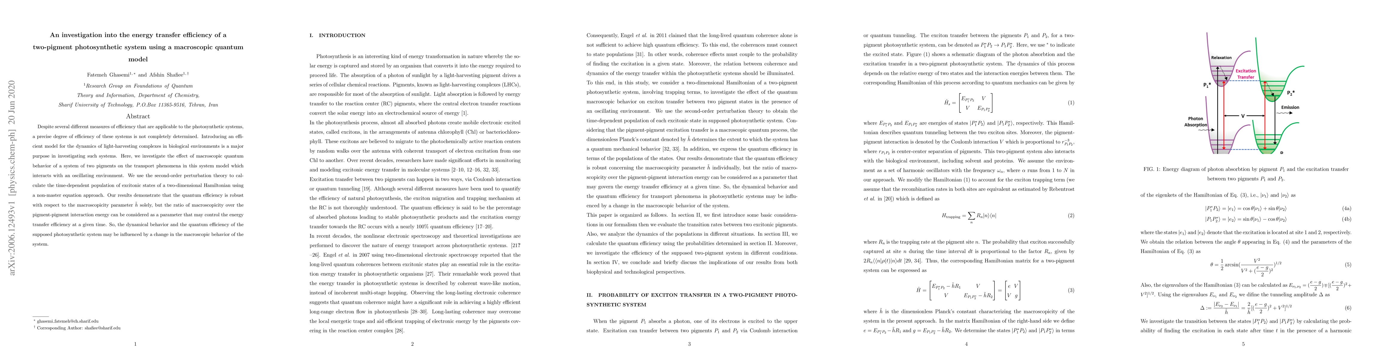 This paper investigates the energy transfer efficiency in a two-pigment photosynthetic system using a macroscopic quantum model, demonstrating that quantum efficiency is robust but can be influenced by the ratio of macroscopicity to pigment-pigment interaction energy, suggesting a control over energy transfer efficiency.
