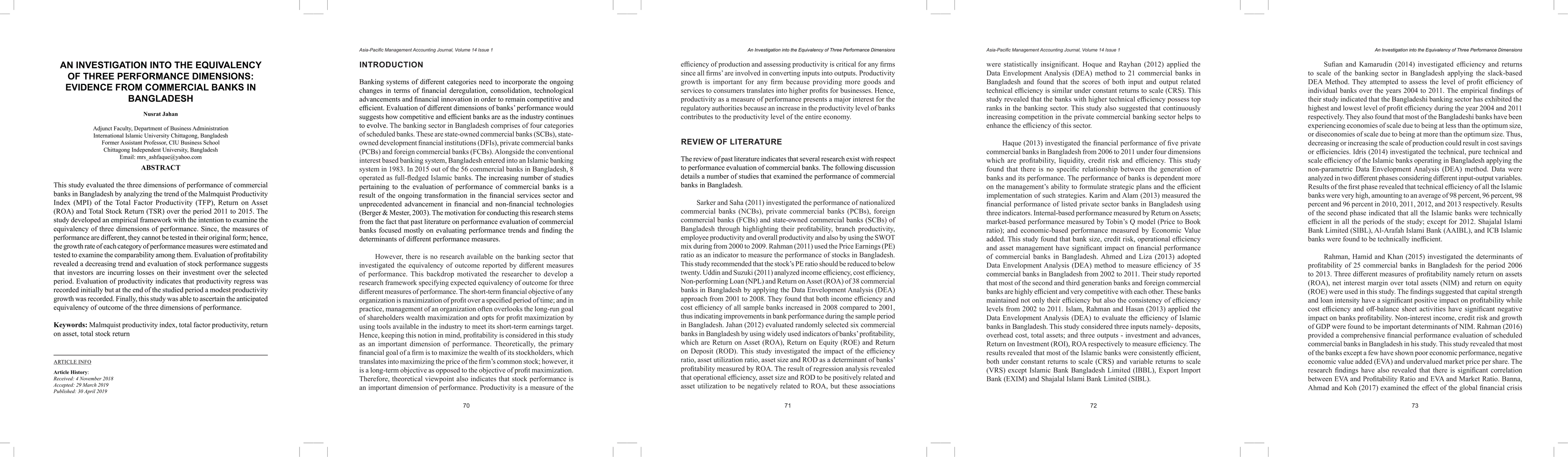 This study investigates the equivalency of three performance dimensions—Total Factor Productivity (TFP), Return on Asset (ROA), and Total Stock Return (TSR)—in Bangladeshi commercial banks using the Malmquist Productivity Index from 2011 to 2015. It found decreasing profitability and negative stock returns, but a modest productivity growth towards the end, concluding equivalency among the three performance measures.