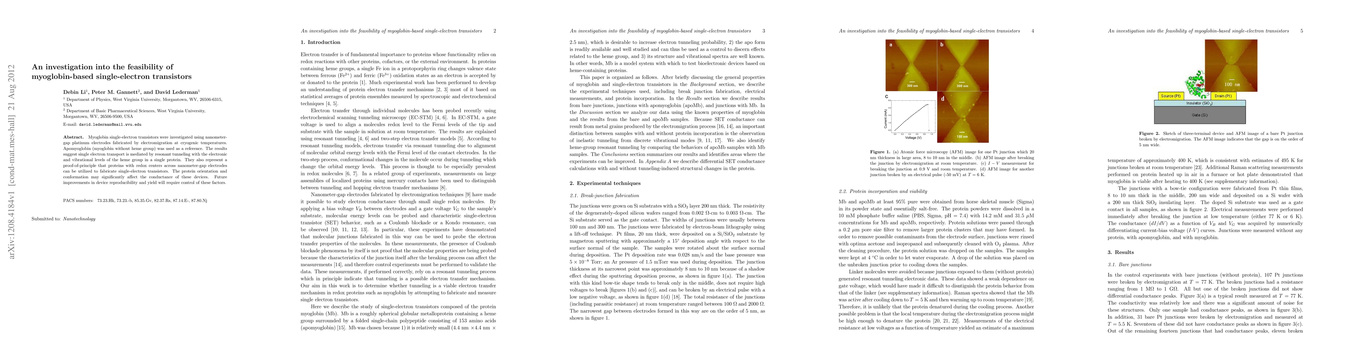 This study investigates the feasibility of using myoglobin as a component in single-electron transistors, demonstrating that single electron transport is mediated by resonant tunneling through the heme group. The findings provide a proof-of-principle for utilizing proteins with redox centers in nanoelectronics, though protein orientation and conformation are identified as crucial factors for device performance.