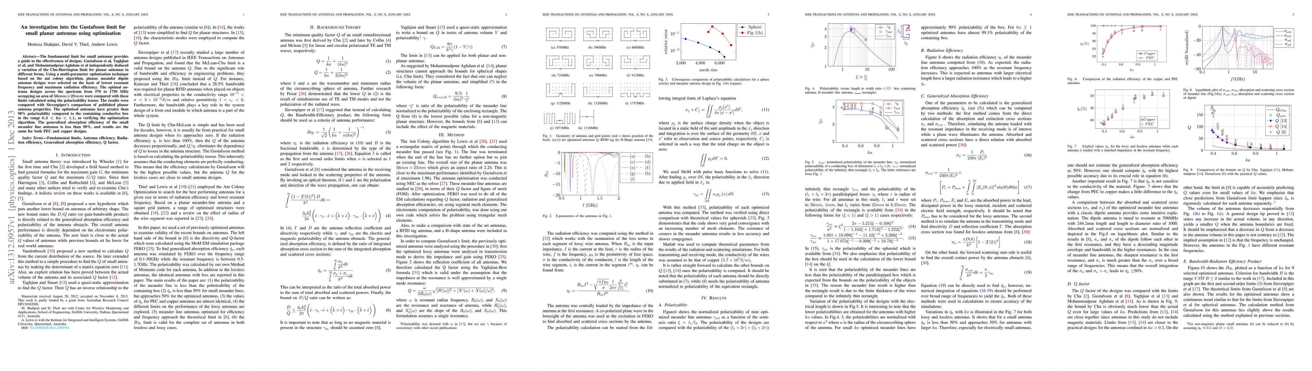 This paper investigates the effectiveness of small planar antennas using an optimisation technique based on the ant colony algorithm. The study verifies the Gustafsson limit for these antennas, showing optimised designs achieve greater than 90% polarizability within a specified frequency range, while maintaining absorption efficiency below 50%.