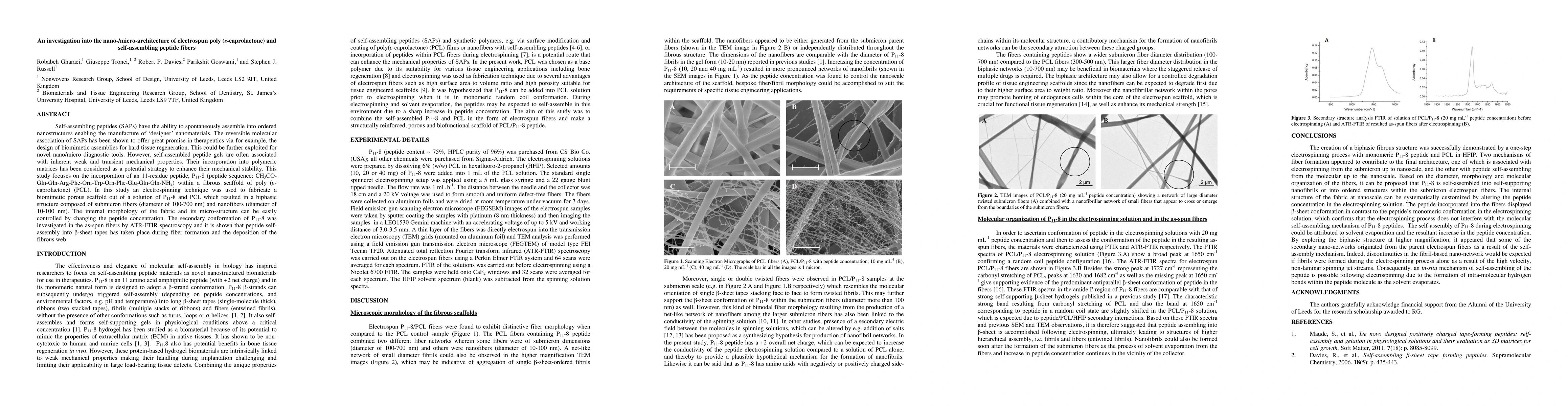 This study investigates the nano-/micro-architecture of electrospun poly ({\epsilon}-caprolactone) and self-assembling peptide fibers, focusing on the incorporation of P11-8 peptide within a PCL scaffold to enhance mechanical stability. The electrospinning technique produced a biphasic structure of submicron and nanofibers, with peptide self-assembly into beta-sheet tapes confirmed by ATR-FTIR spectroscopy.