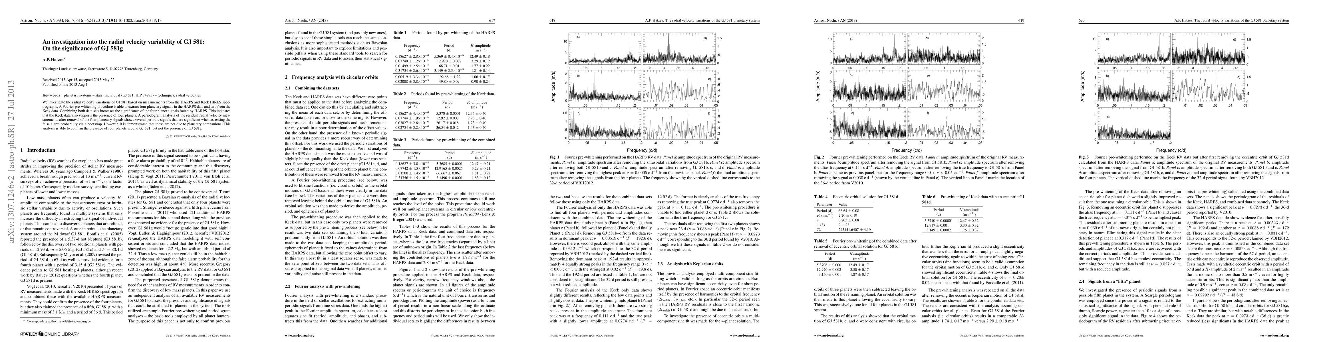 This study investigates the radial velocity variations of GJ 581 using HARPS and Keck data, confirming four planetary signals but not finding evidence for the proposed GJ 581g. The analysis rules out additional planets as sources of residual signals.
