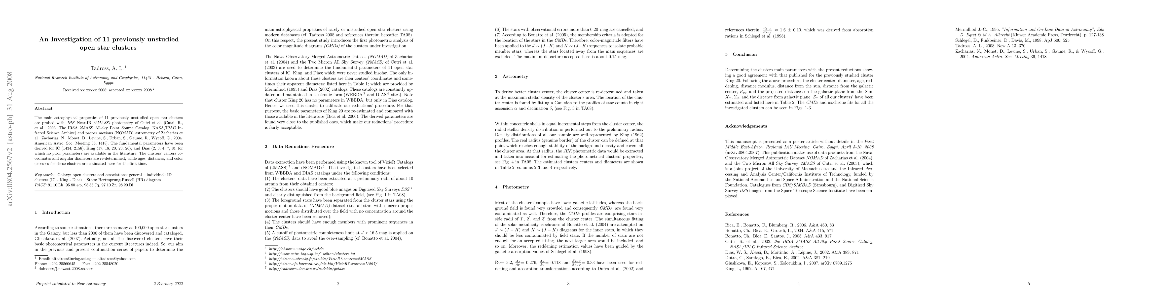 The main astrophysical properties of 11 previously unstudied open star clusters are probed with JHK Near-IR (2MASS) photometry of Cutri et al. [Cutri, R., et al., 2003. The IRSA 2MASS All-sky Point Source Catalog, NASA/IPAC Infrared Science Archive] and proper motions (NOMAD) astrometry of Zacharias et al. [Zacharias, N., Monet, D., Levine, S., Urban, S., Gaume, R., Wycoff, G., 2004. American Astro. Soc. Meeting 36, 1418]. The fundamental parameters have been derived for IC (1434, 2156); King (17, 18, 20, 23, 26)}; and Dias (2, 3, 4, 7, 8)}, for which no prior parameters are available in the literature. The clusters' centers coordinates and angular diameters are re-determined, while ages, distances, and color excesses for these clusters are estimated here for the first time.