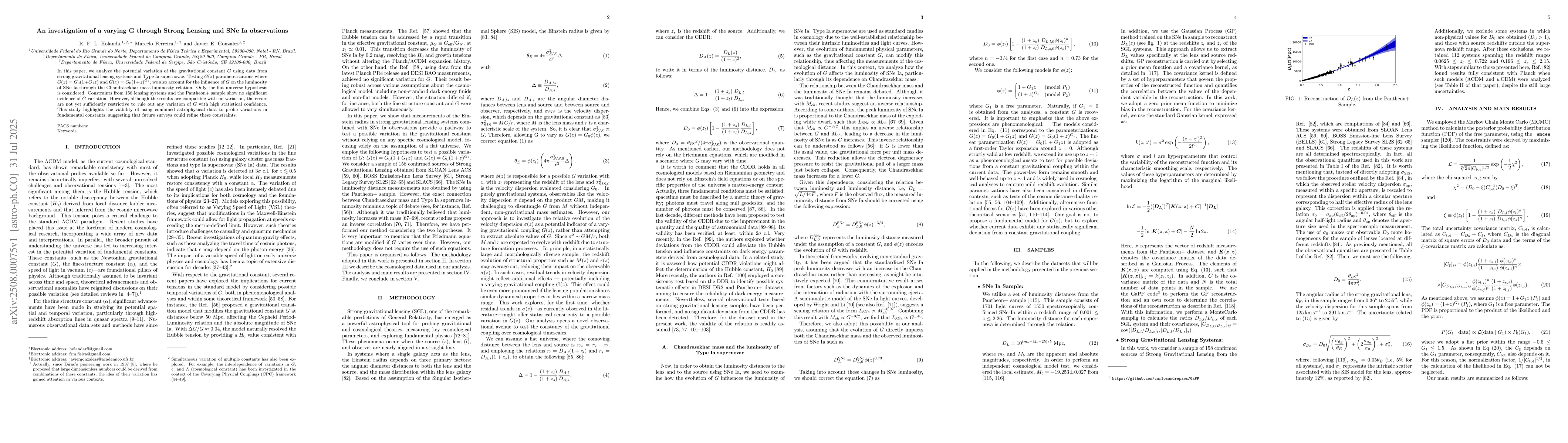 In this paper, we analyze the potential variation of the gravitational constant $G$ using data from strong gravitational lensing systems and Type Ia supernovae. Testing $G(z)$ parameterizations where $G(z) = G_0(1 + G_1z)$ and $G(z) = G_0(1 + z)^{G_1}$, we also account for the influence of $G$ on the luminosity of SNe Ia through the Chandrasekhar mass-luminosity relation. Only the flat universe hypothesis is considered. Constraints from 158 lensing systems and the Pantheon+ sample show no significant evidence of $G$ variation. However, although the results are compatible with no variation, the errors are not yet sufficiently restrictive to rule out any variation of $G$ with high statistical confidence. This study highlights the viability of using combined astrophysical data to probe variations in fundamental constants, suggesting that future surveys could refine these constraints.