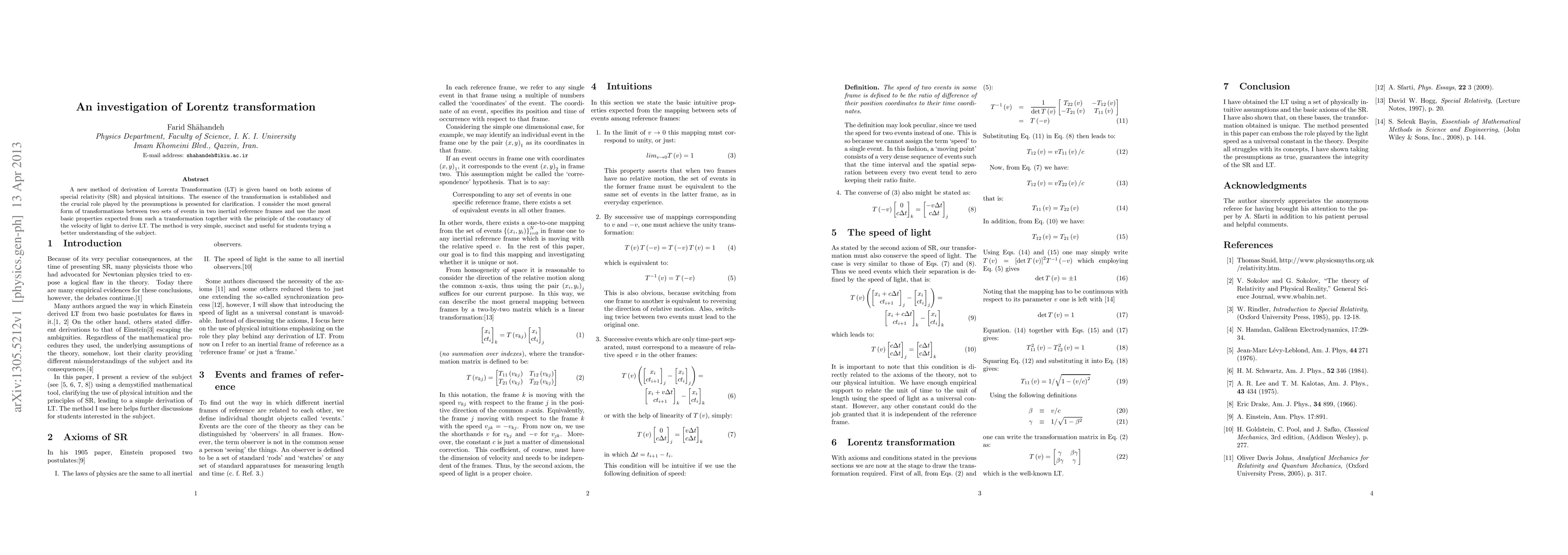 This paper presents a new, intuitive method for deriving the Lorentz Transformation, grounded in the axioms of special relativity and basic properties of transformations, aiming to enhance student comprehension. The method emphasizes the importance of the constancy of light velocity and offers a clear, simplified approach.