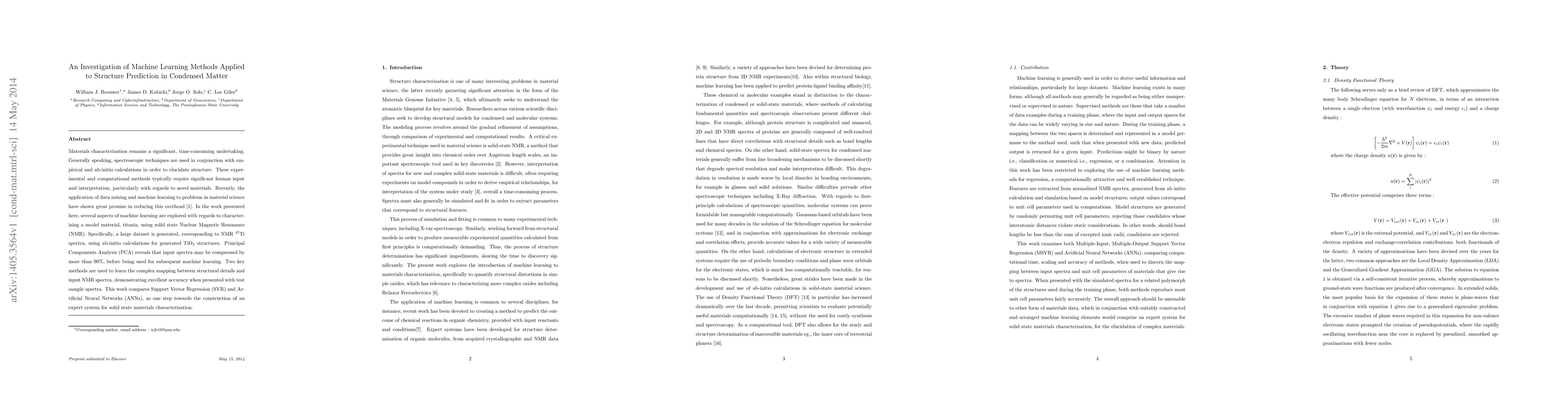 Materials characterization remains a significant, time-consuming undertaking. Generally speaking, spectroscopic techniques are used in conjunction with empirical and ab-initio calculations in order to elucidate structure. These experimental and computational methods typically require significant human input and interpretation, particularly with regards to novel materials. Recently, the application of data mining and machine learning to problems in material science have shown great promise in reducing this overhead. In the work presented here, several aspects of machine learning are explored with regards to characterizing a model material, titania, using solid-state Nuclear Magnetic Resonance (NMR). Specifically, a large dataset is generated, corresponding to NMR $^{47}$Ti spectra, using ab-initio calculations for generated TiO$_2$ structures. Principal Components Analysis (PCA) reveals that input spectra may be compressed by more than 90%, before being used for subsequent machine learning. Two key methods are used to learn the complex mapping between structural details and input NMR spectra, demonstrating excellent accuracy when presented with test sample spectra. This work compares Support Vector Regression (SVR) and Artificial Neural Networks (ANNs), as one step towards the construction of an expert system for solid state materials characterization.