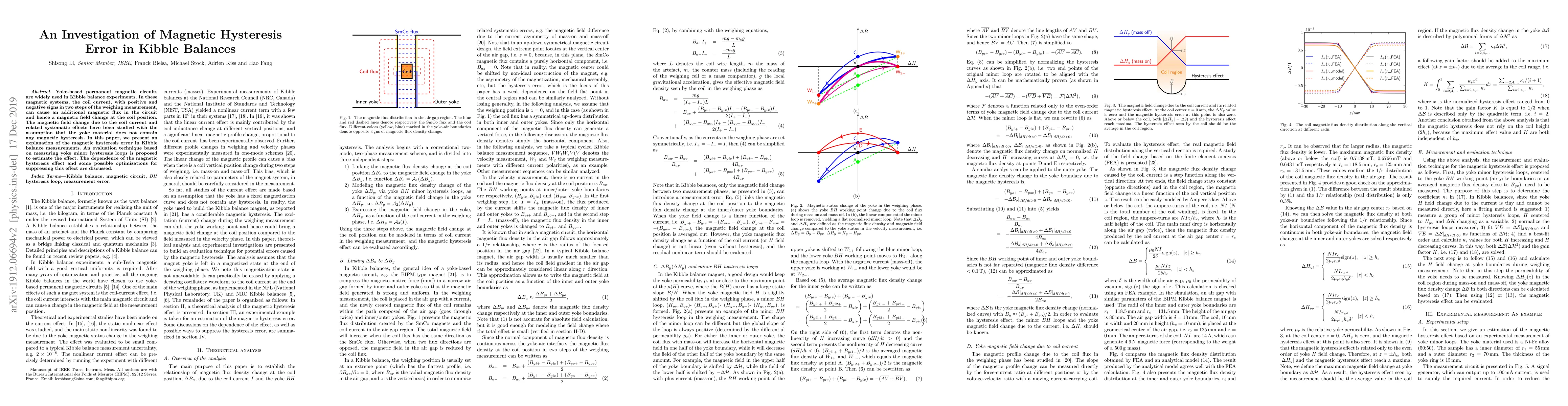 This paper investigates the magnetic hysteresis error in Kibble balances, attributing it to the coil current's impact on the yoke's magnetic field. A method for estimating this error through measuring yoke minor hysteresis loops is proposed, along with discussions on its dependence and potential optimizations for reduction.