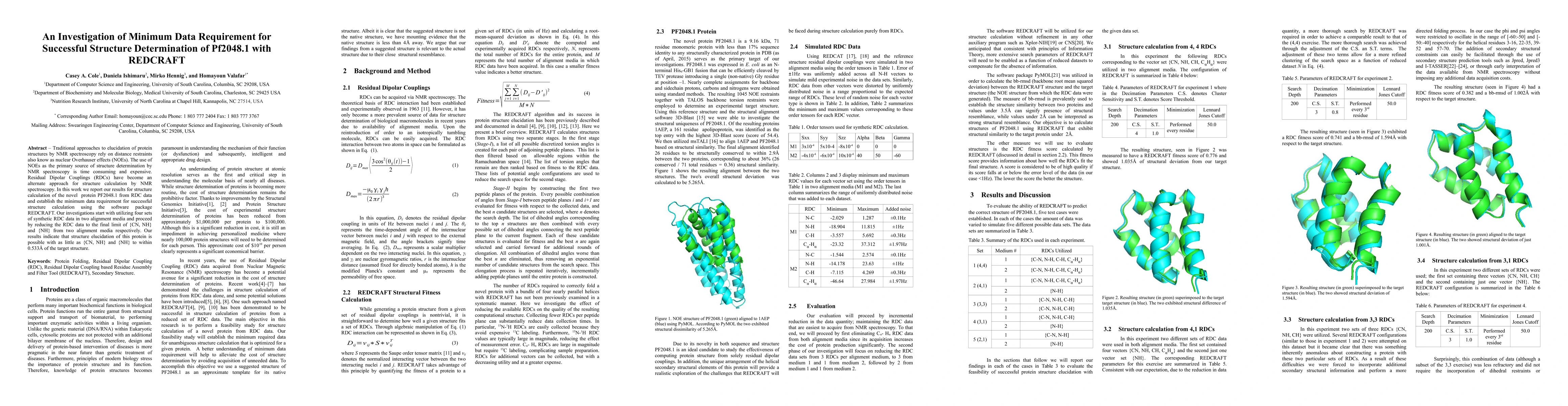 This paper investigates the minimum data requirement for determining the structure of the protein PF2048.1 using Residual Dipolar Couplings (RDCs) with REDCRAFT, finding that as few as {CN, NH} and {NH} RDCs from two alignment media can achieve structure elucidation within 0.533 Å of the target structure.