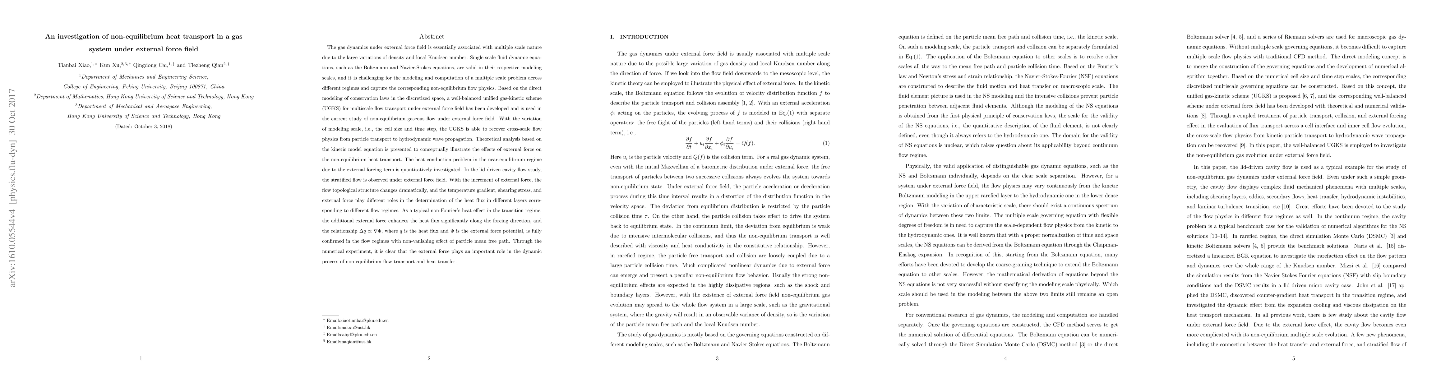 The gas dynamics under external force field is essentially associated with multiple scale nature due to the large variations of density and local Knudsen number. Single scale fluid dynamic equations, such as the Boltzmann and Navier-Stokes equations, are valid in their respective modeling scales, and it is challenging for the modeling and computation of a multiple scale problem across different regimes and capture the corresponding non-equilibrium flow physics. Based on the direct modeling of conservation laws in the discretized space, a well-balanced unified gas-kinetic scheme (UGKS) for multiscale flow transport under external force field has been developed and is used in the current study of non-equilibrium gaseous flow under external force field. With the variation of modeling scale, i.e., the cell size and time step, the UGKS is able to recover cross-scale flow physics from particle transport to hydrodynamic wave propagation. Theoretical analysis based on the kinetic model equation is presented to conceptually illustrate the effects of external force on the non-equilibrium heat transport.