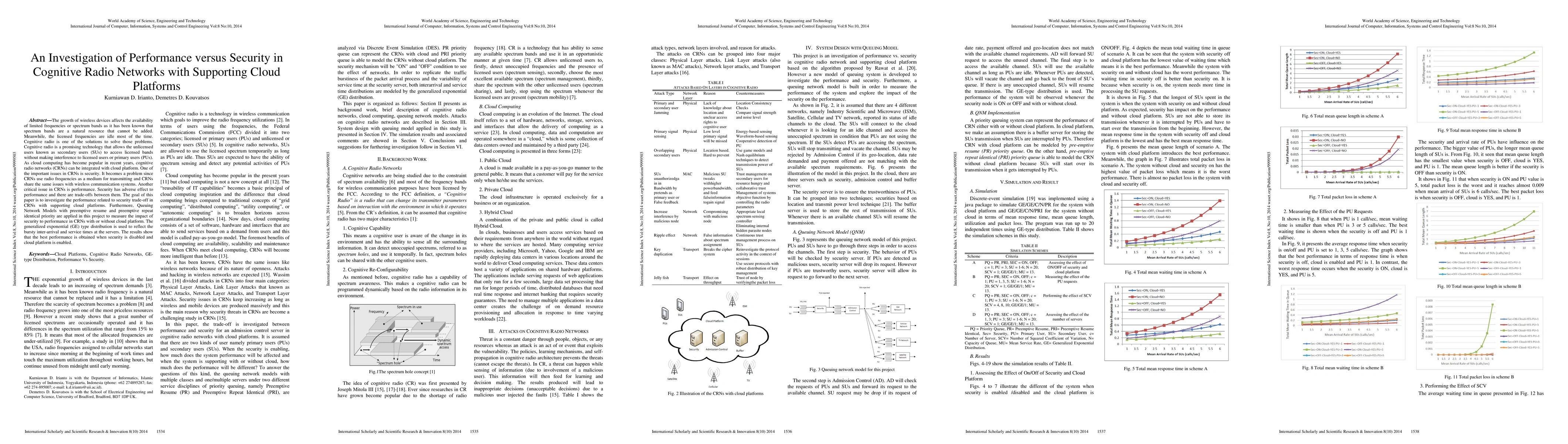 This paper investigates the trade-off between performance and security in cognitive radio networks (CRNs) enhanced by cloud platforms. It employs queuing network models to measure the impact of security on CRN performance, revealing that the best performance occurs when security is disabled but the cloud platform is enabled.