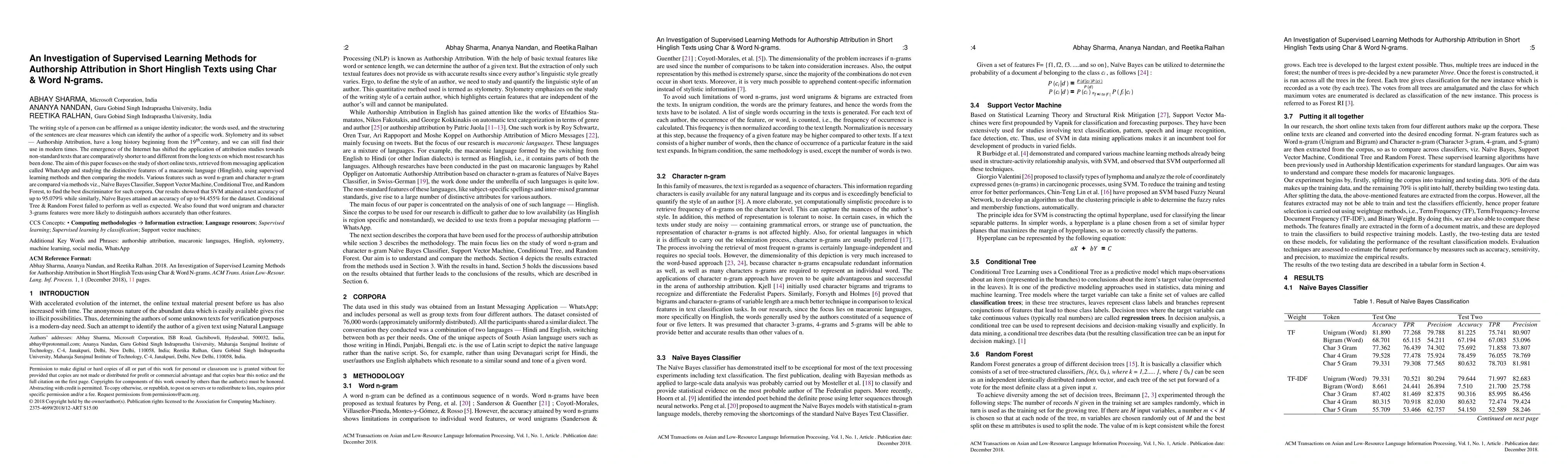 This paper investigates supervised learning methods for authorship attribution in short Hinglish texts, comparing Naive Bayes, SVM, Conditional Tree, and Random Forest using word and character n-grams. The study found that SVM achieved the highest accuracy at 95.079%, while Naive Bayes followed closely at 94.455%, with word unigrams and character 3-grams proving most effective.