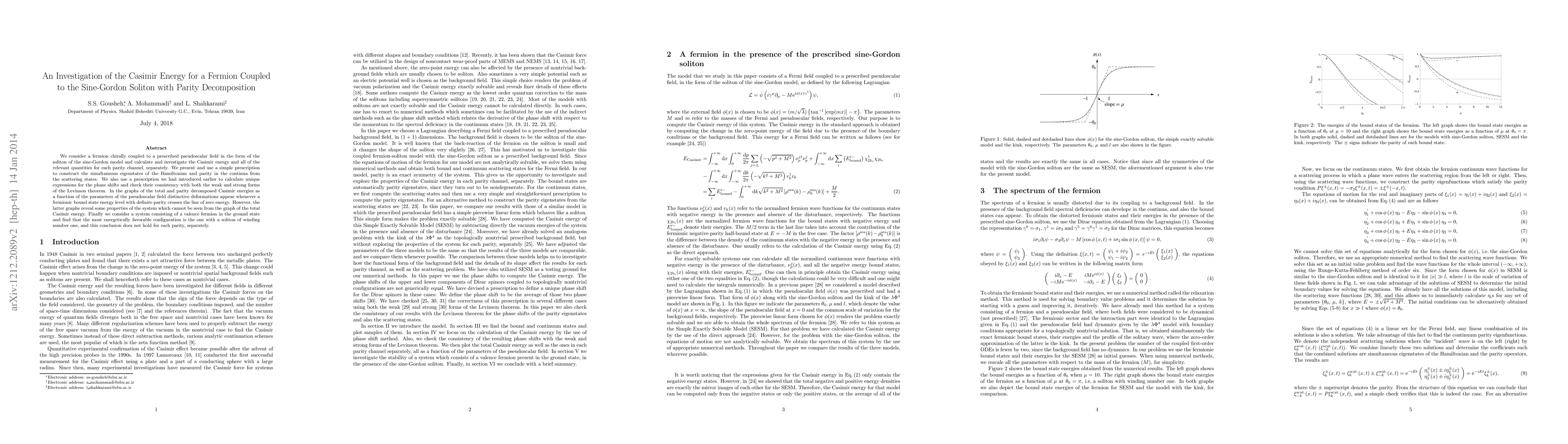 We consider a fermion chirally coupled to a prescribed pseudoscalar field in the form of the soliton of the sine-Gordon model and calculate and investigate the Casimir energy and all of the relevant quantities for each parity channel, separately. We present and use a simple prescription to construct the simultaneous eigenstates of the Hamiltonian and parity in the continua from the scattering states. We also use a prescription we had introduced earlier to calculate unique expressions for the phase shifts and check their consistency with both the weak and strong forms of the Levinson theorem. In the graphs of the total and parity decomposed Casimir energies as a function of the parameters of the pseudoscalar field distinctive deformations appear whenever a fermionic bound state energy level with definite parity crosses the line of zero energy. However, the latter graphs reveal some properties of the system which cannot be seen from the graph of the total Casimir energy. Finally we consider a system consisting of a valence fermion in the ground state and find that the most energetically favorable configuration is the one with a soliton of winding number one, and this conclusion does not hold for each parity, separately.