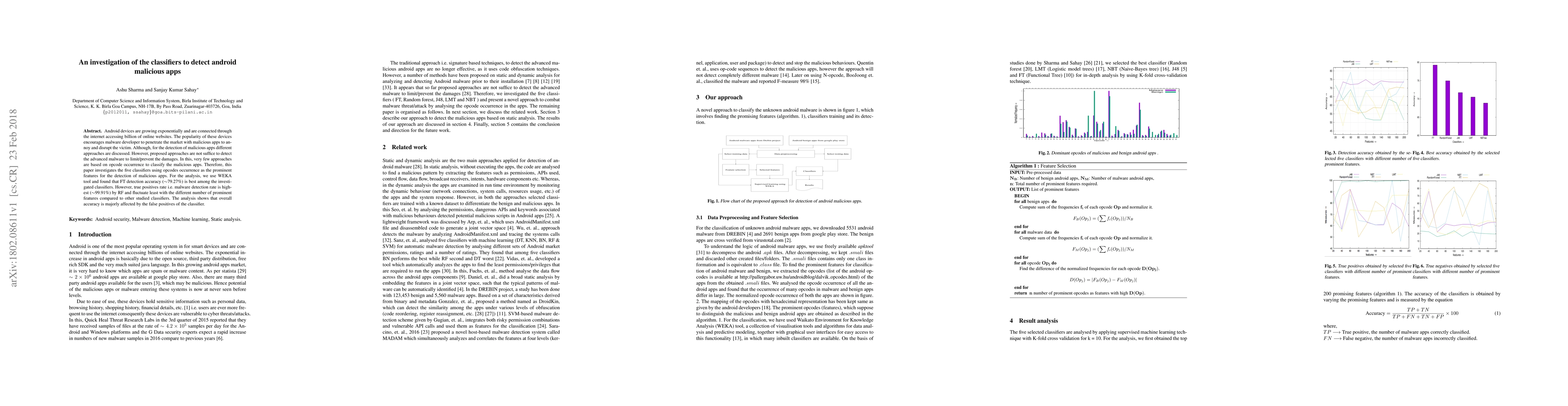 This paper investigates five classifiers for detecting malicious Android apps using opcode occurrence as features. FT classifier shows the highest detection accuracy (79.27%), while RF has the highest true positive rate (99.91%) and the least fluctuation with varying feature sets, highlighting the impact of false positives on overall accuracy.