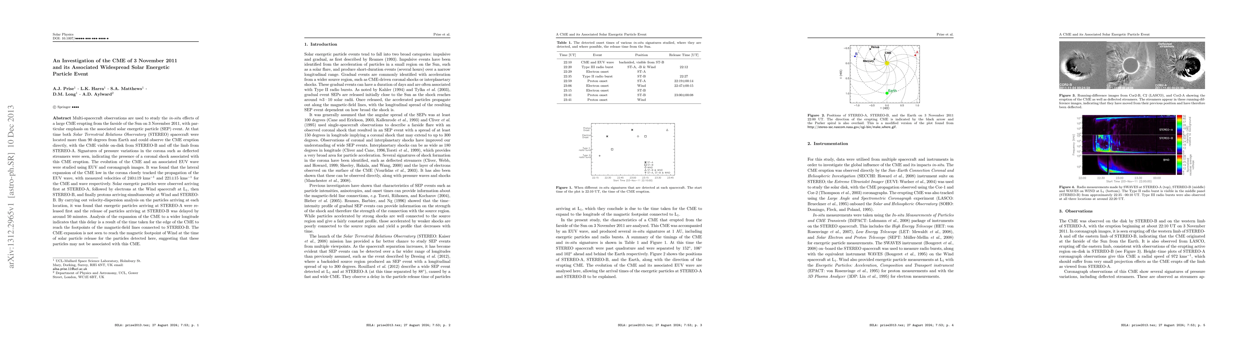 This study investigates the 3 November 2011 CME and its associated solar energetic particle event using multi-spacecraft observations. The CME's lateral expansion was found to track the propagation of an EUV wave, and particle release times varied, indicating a delay in particle arrival at STEREO-B due to the CME's magnetic-field line connection.