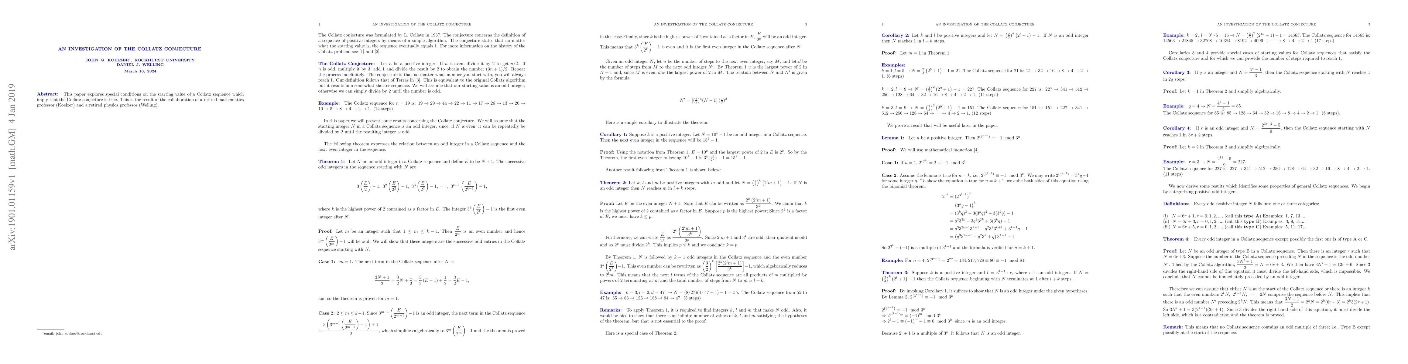 This paper explores special conditions on the starting value of a Collatz sequence which imply that the Collatz conjecture is true. This is the result of the collaboration of a retired mathematics professor (Koelzer) and a retired physics professor (Welling).