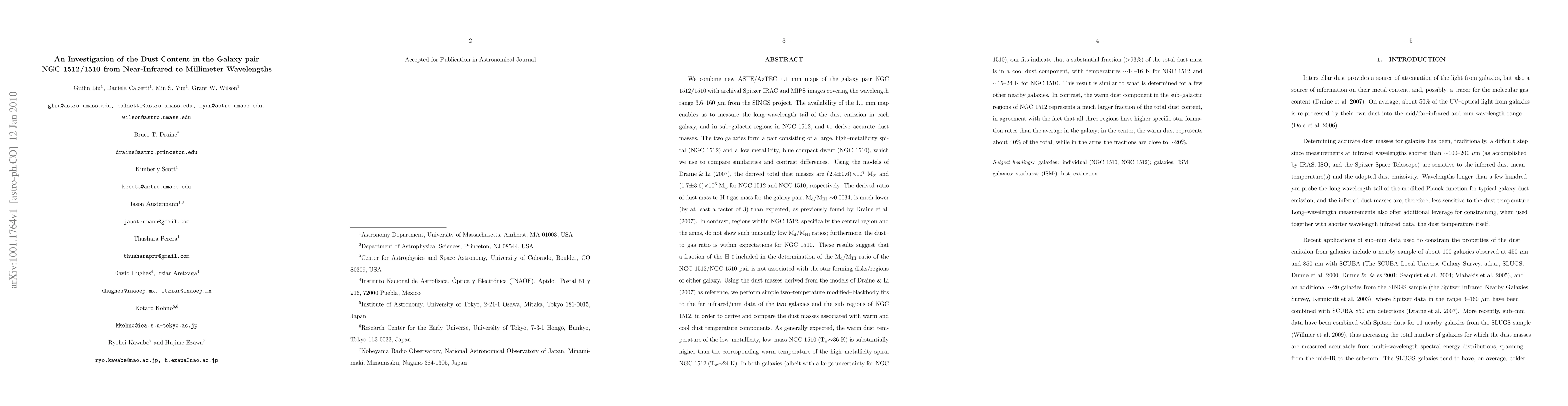 We combine new ASTE/AzTEC 1.1 mm maps of the galaxy pair NGC 1512/1510 with archival Spitzer IRAC and MIPS images covering the wavelength range 3.6--160 um from the SINGS project to derive accurate dust masses in each galaxy, and in sub--galactic regions in NGC 1512. The two galaxies form a pair consisting of a large, high--metallicity spiral (NGC 1512) and a low metallicity, blue compact dwarf (NGC 1510). The derived total dust masses are (2.4+/-0.6) 10^7 Msun and (1.7+/-3.6) 10^5 Msun for NGC 1512 and NGC 1510, respectively. The derived ratio of dust mass to H I gas mass for the galaxy pair (0.0034) is much lower than expected, while regions within NGC 1512, specifically the central region and the arms, do not show such unusually low ratios; furthermore, the dust--to--gas ratio is within expectations for NGC 1510. These results suggest that a fraction of the H I included in the determination of the M_d/M_HI ratio of the NGC 1512/1510 pair is not associated with the star forming disks/regions of either galaxy. We also perform simple two--temperature (warm + cold) modified--blackbody fits to the far--infrared/mm data. The warm dust temperature of the low--metallicity NGC 1510 (~36 K) is substantially higher than that of the high--metallicity NGC 1512 (~24 K). In both galaxies, a substantial fraction (>93%) of the total dust mass is in a cool dust component, with temperatures 14--16 K for NGC 1512 and 15--24 K for NGC 1510. In contrast, the warm dust in the arms and central regions of NGC 1512 represents a much larger fraction of the total dust content, in agreement with the fact that all three regions have higher specific star formation rates than the average in the galaxy.