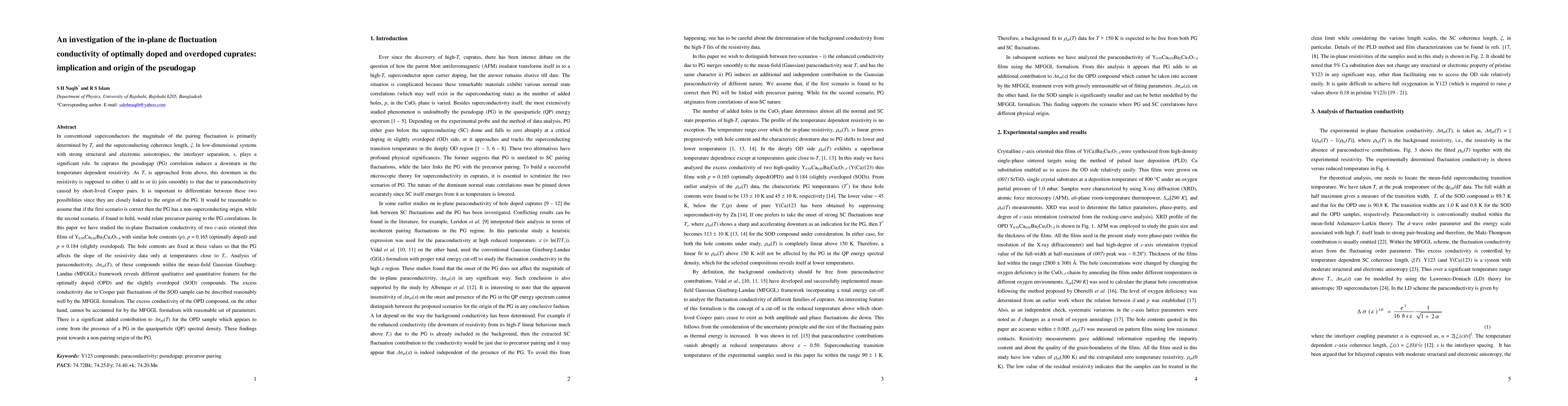 This study investigates the in-plane dc fluctuation conductivity in optimally doped and overdoped cuprates, revealing that the pseudogap (PG) in the optimally doped sample has a non-superconducting origin, while the overdoped sample's PG correlates with precursor pairing. The analysis shows distinct excess conductivity behaviors in the two samples, suggesting different origins for PG in cuprate superconductors.