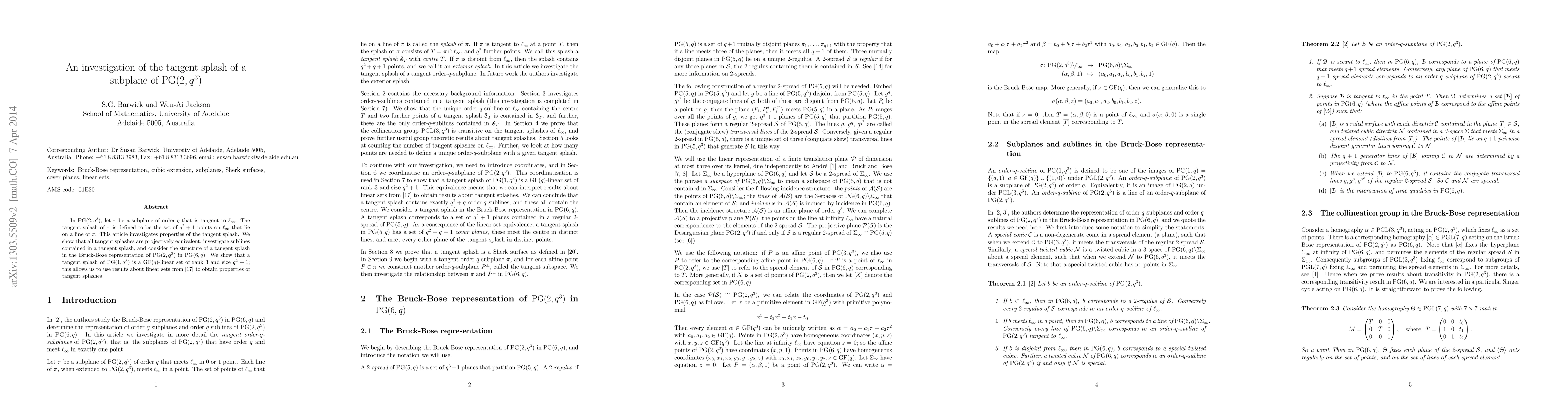 This research investigates the properties of tangent splashes in the subplane of order $q$ in $PG(2,q^3)$, showing that all tangent splashes are projectively equivalent and exploring their structure and sublines. It concludes that a tangent splash forms a $GF(q)$-linear set of rank 3 and size $q^2+1$.