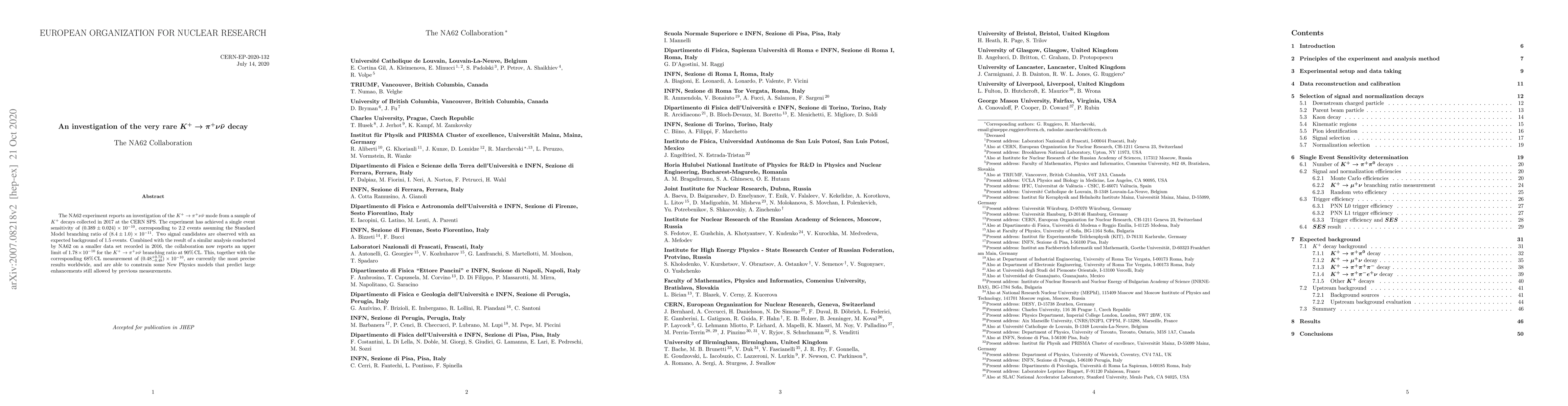 The NA62 experiment reports an investigation of the rare $K^+ ightarrowpi^+ uar{ u}$ decay, achieving a single event sensitivity of $(0.389pm 0.024) imes10^{-10}$. With two observed signal candidates and an expected background of 1.5 events, the collaboration sets an upper limit of $1.78 imes10^{-10}$ at 90% CL for the decay's branching ratio. This is the most precise result worldwide, constraining some New Physics models.