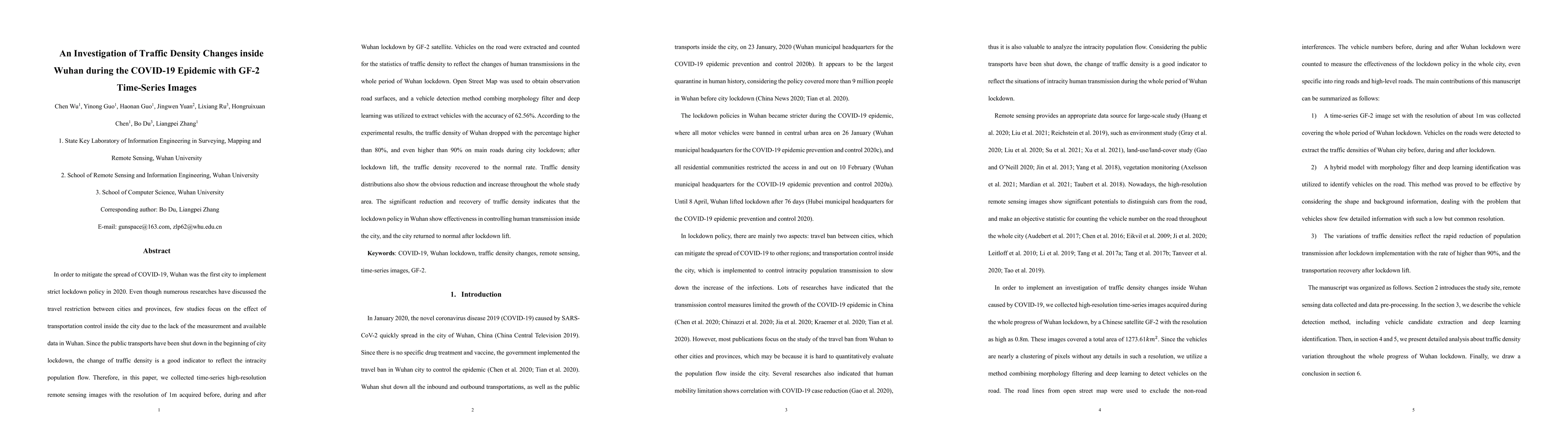 This study used satellite images to track traffic density changes in Wuhan during COVID-19 lockdown, finding that traffic dropped by over 80% and recovered after the lift, indicating effective control of human transmission.