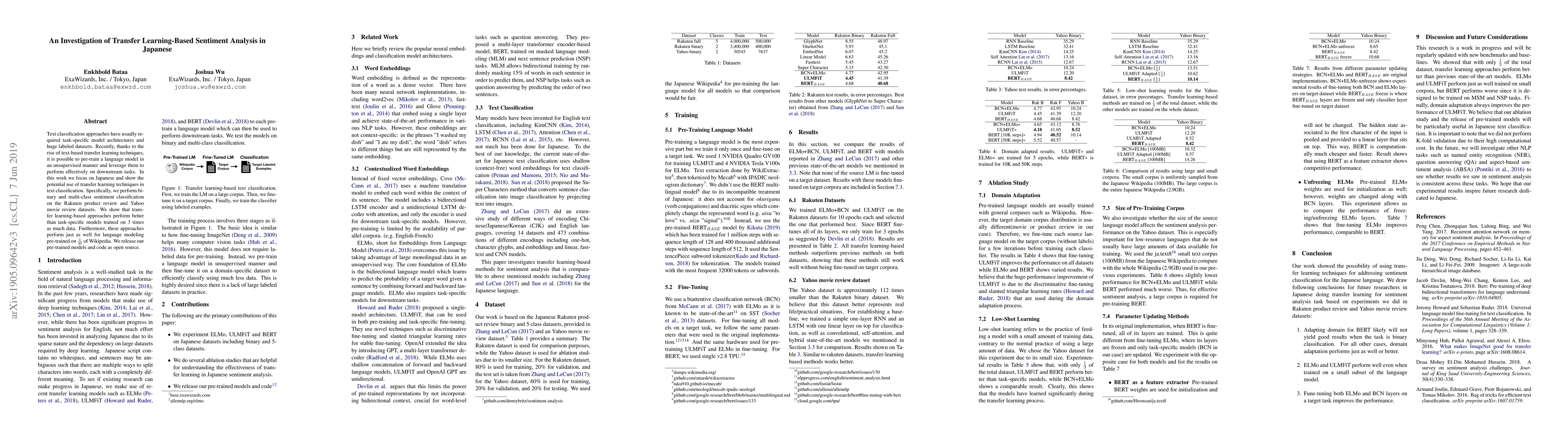 This paper investigates the effectiveness of transfer learning for Japanese sentiment analysis, demonstrating superior performance using pre-trained models compared to task-specific models, even when trained on significantly smaller datasets. The study releases pre-trained models and code to facilitate further research.