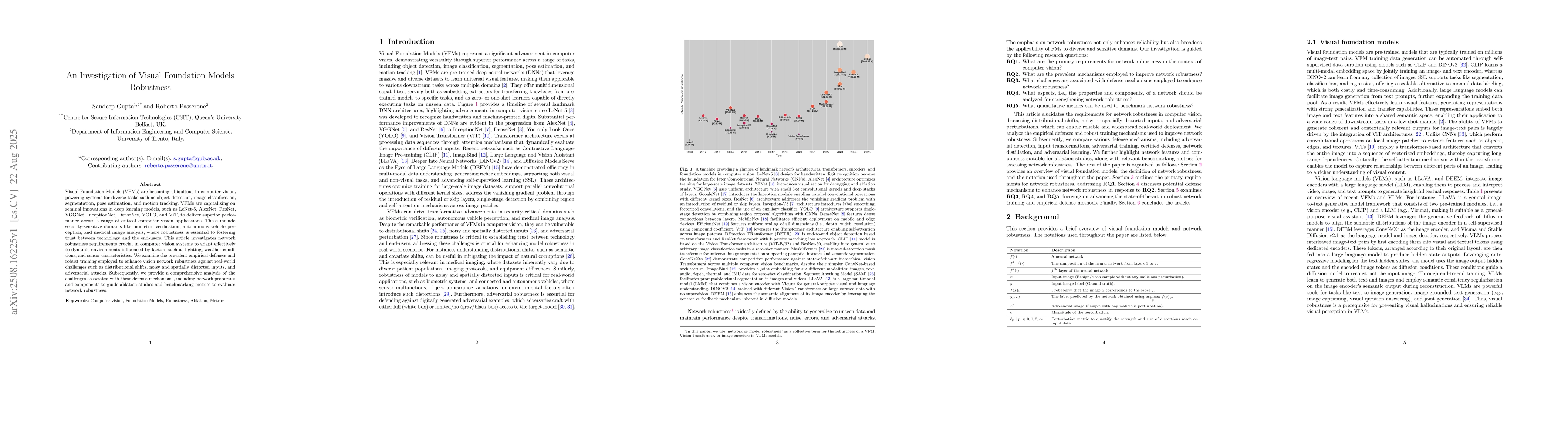 Visual Foundation Models (VFMs) are becoming ubiquitous in computer vision, powering systems for diverse tasks such as object detection, image classification, segmentation, pose estimation, and motion tracking. VFMs are capitalizing on seminal innovations in deep learning models, such as LeNet-5, AlexNet, ResNet, VGGNet, InceptionNet, DenseNet, YOLO, and ViT, to deliver superior performance across a range of critical computer vision applications. These include security-sensitive domains like biometric verification, autonomous vehicle perception, and medical image analysis, where robustness is essential to fostering trust between technology and the end-users. This article investigates network robustness requirements crucial in computer vision systems to adapt effectively to dynamic environments influenced by factors such as lighting, weather conditions, and sensor characteristics. We examine the prevalent empirical defenses and robust training employed to enhance vision network robustness against real-world challenges such as distributional shifts, noisy and spatially distorted inputs, and adversarial attacks. Subsequently, we provide a comprehensive analysis of the challenges associated with these defense mechanisms, including network properties and components to guide ablation studies and benchmarking metrics to evaluate network robustness.