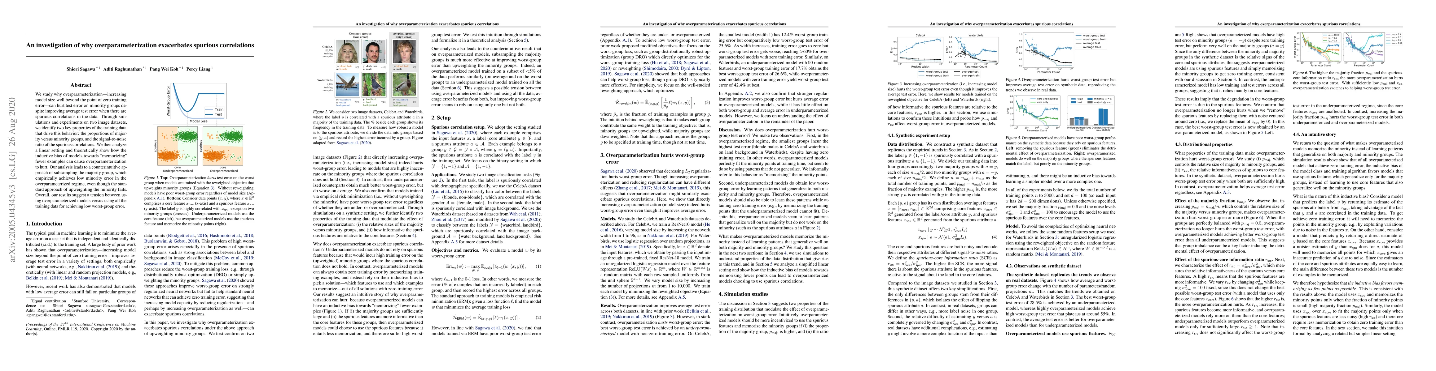 This paper investigates why overparameterized models can worsen test error for minority groups despite improving average test error, attributing it to the proportions of majority versus minority groups and the strength of spurious correlations. It proposes subsampling the majority group as a counterintuitive solution to achieve low minority error in overparameterized settings.