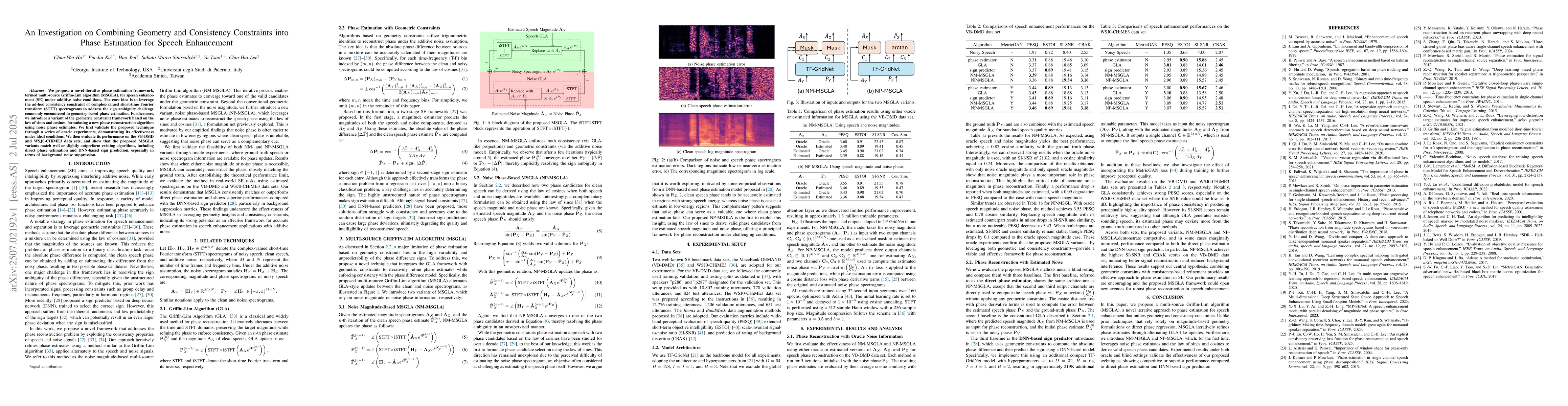 The paper introduces a new phase estimation framework, MSGLA, for speech enhancement in noisy conditions. It combines geometry and consistency constraints, outperforming existing methods in noise suppression, as validated through experiments on various datasets.