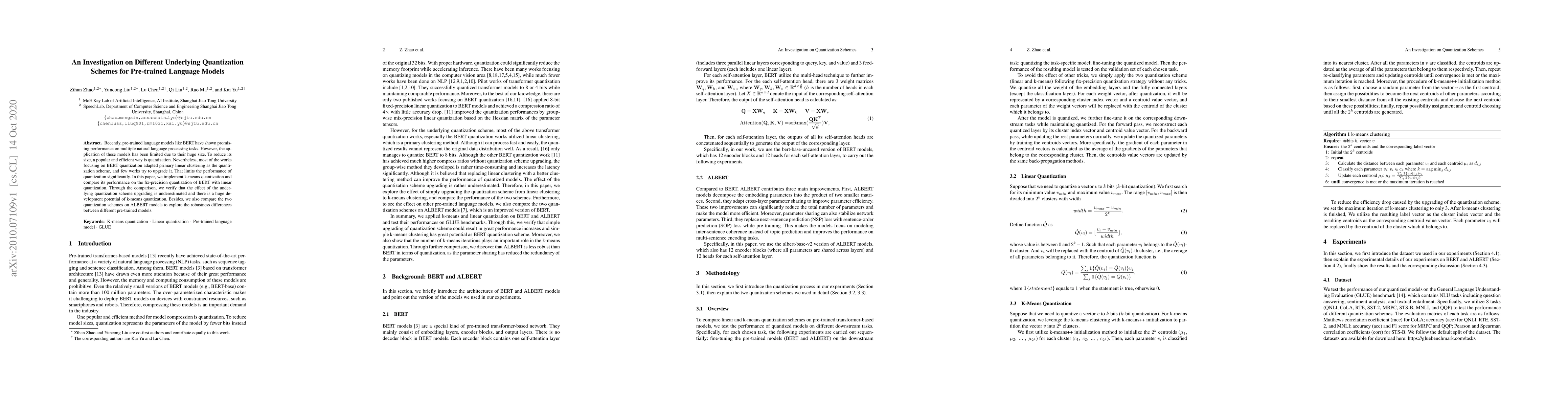 This paper investigates the performance of k-means quantization compared to linear quantization for reducing the size of pre-trained language models like BERT and ALBERT. The study finds that k-means quantization offers significant performance improvements and development potential over traditional linear quantization methods.