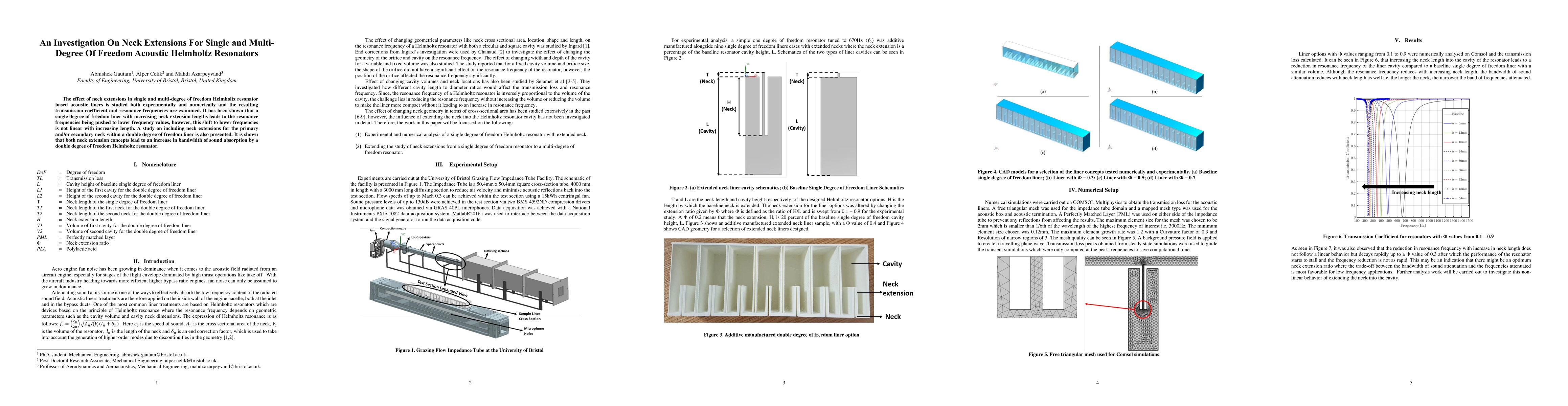 The effect of neck extensions in single and multi-degree of freedom Helmholtz resonator based acoustic liners is studied both experimentally and numerically and the resulting transmission coefficient and resonance frequencies are examined. It has been shown that a single degree of freedom liner with increasing neck extension lengths leads to the resonance frequencies being pushed to lower frequency values, however, this shift to lower frequencies is not linear with increasing length. A study on including neck extensions for the primary and/or secondary neck within a double degree of freedom liner is also presented. It is shown that both neck extension concepts lead to an increase in bandwidth of sound absorption by a double degree of freedom Helmholtz resonator.
