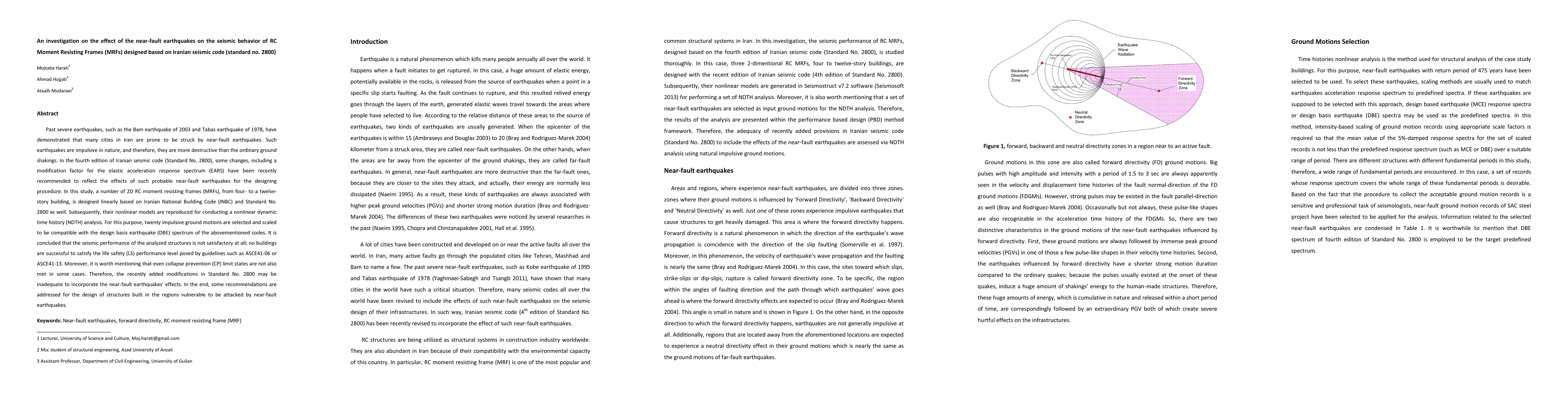 This study investigates the seismic behavior of RC moment resisting frames designed per the Iranian seismic code (Standard No. 2800) subjected to near-fault earthquakes. The analysis reveals unsatisfactory performance, failing to meet life safety and even collapse prevention criteria, suggesting the current code modifications may be insufficient.