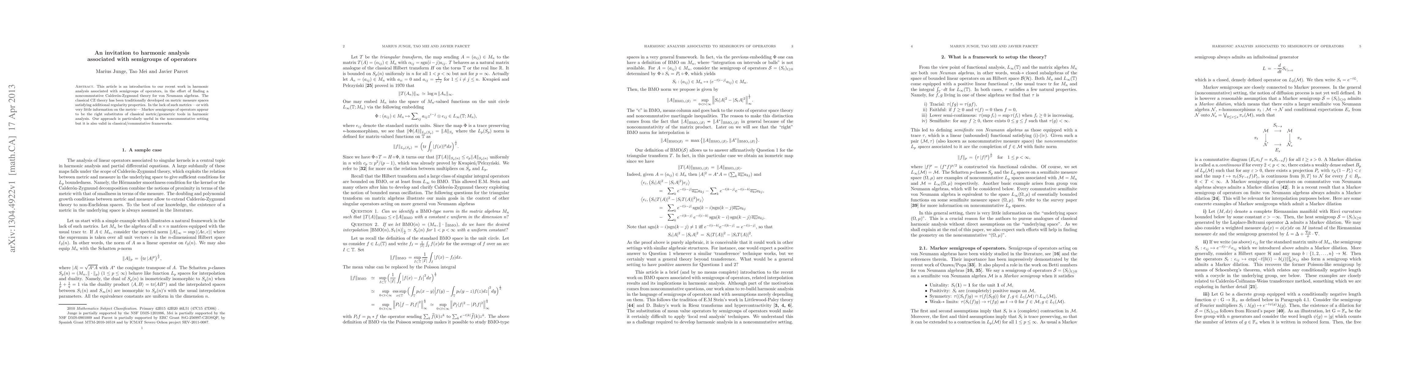 This article is an introduction to our recent work in harmonic analysis associated with semigroups of operators, in the effort of finding a noncommutative Calder\'on-Zygmund theory for von Neumann algebras. The classical CZ theory has been traditionally developed on metric measure spaces satisfying additional regularity properties. In the lack of such metrics -or with very little information on the metric- Markov semigroups of operators appear to be the right substitutes of classical metric/geometric tools in harmonic analysis. Our approach is particularly useful in the noncommutative setting but it is also valid in classical/commutative frameworks.
