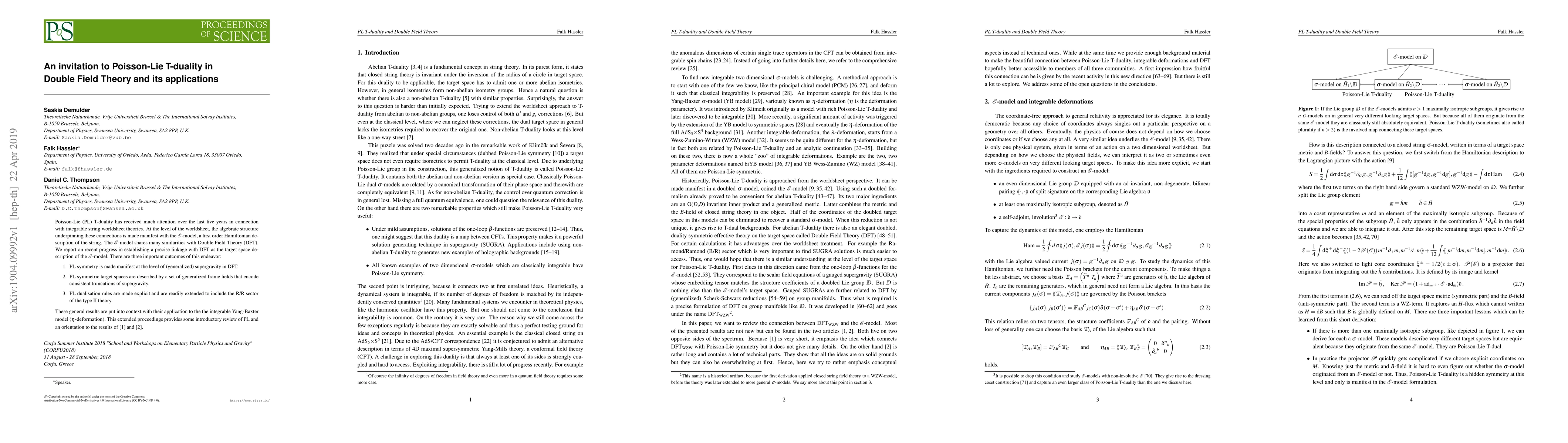 Poisson-Lie (PL) T-duality has received much attention over the last five years in connection with integrable string worldsheet theories. At the level of the worldsheet, the algebraic structure underpinning these connections is made manifest with the $\mathcal{E}$-model, a first order Hamiltonian description of the string. The $\mathcal{E}$-model shares many similarities with Double Field Theory (DFT). We report on recent progress in establishing a precise linkage with DFT as the target space description of the $\mathcal{E}$-model. There are three important outcomes of this endeavor: 1) PL symmetry is made manifest at the level of (generalized) supergravity in DFT. 2) PL symmetric target spaces are described by a set of generalized frame fields that encode consistent truncations of supergravity. 3) PL dualisation rules are made explicit and are readily extended to include the R/R sector of the type II theory. These general results are put into context with their application to the the integrable Yang-Baxter model ($\eta$-deformation). This extended proceedings provides some introductory review of PL and an orientation to the results of arXiv:1707.08624 and arXiv:1810.11446.