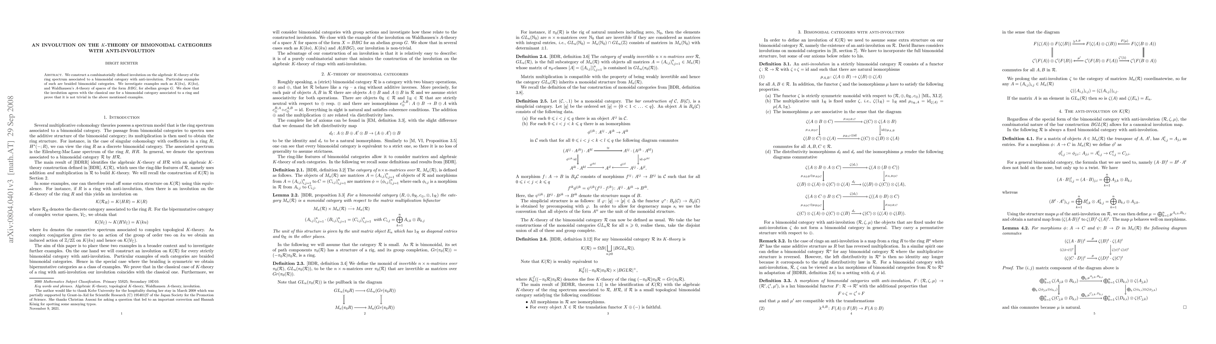 This paper constructs a combinatorial involution on the $K$-theory of bimonoidal categories with anti-involution, showing it aligns with the classical involution for certain categories and proving its non-triviality in examples like algebraic K-theory and Waldhausen's K-theory.