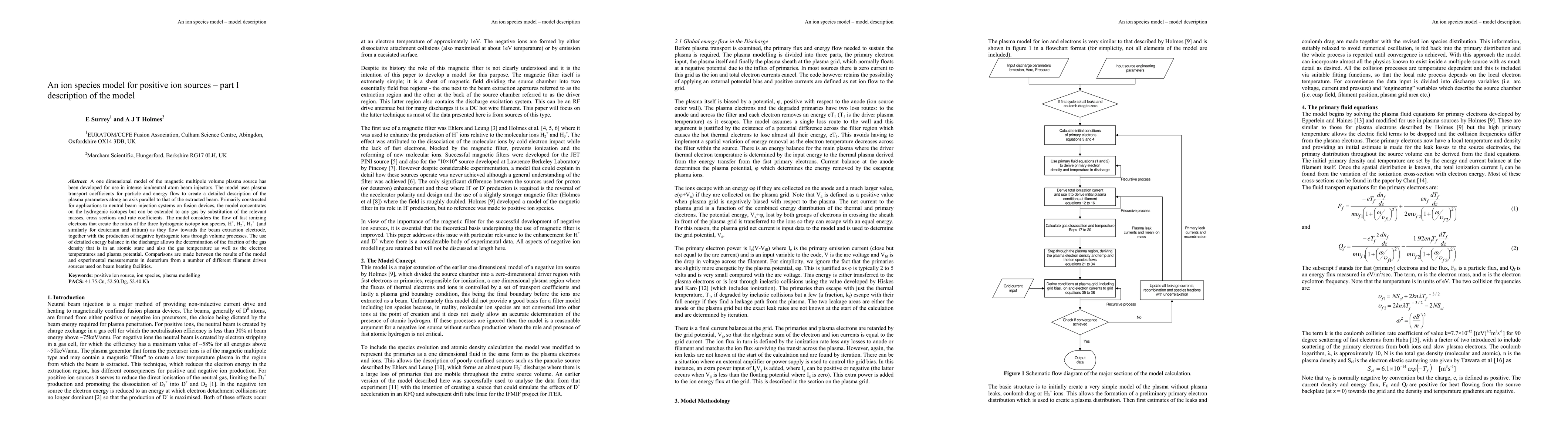 A one dimensional model of the magnetic multipole volume plasma source has been developed for use in intense ion/neutral atom beam injectors. The model uses plasma transport coefficients for particle and energy flow to create a detailed description of the plasma parameters along an axis parallel to that of the extracted beam. Primarily constructed for applications to neutral beam injection systems on fusion devices, the model concentrates on the hydrogenic isotopes but can be extended to any gas by substitution of the relevant masses, cross sections and rate coefficients. The model considers the flow of fast ionizing electrons that create the ratios of the three hydrogenic isotope ion species, H+, H2 +, H3 + (and similarly for deuterium and tritium) as they flow towards the beam extraction electrode, together with the production of negative hydrogenic ions through volume processes. The use of detailed energy balance in the discharge allows the determination of the fraction of the gas density that is in an atomic state and also the gas temperature as well as the electron temperatures and plasma potential. Comparisons are made between the results of the model and experimental measurements in deuterium from a number of different filament driven sources used on beam heating facilities.