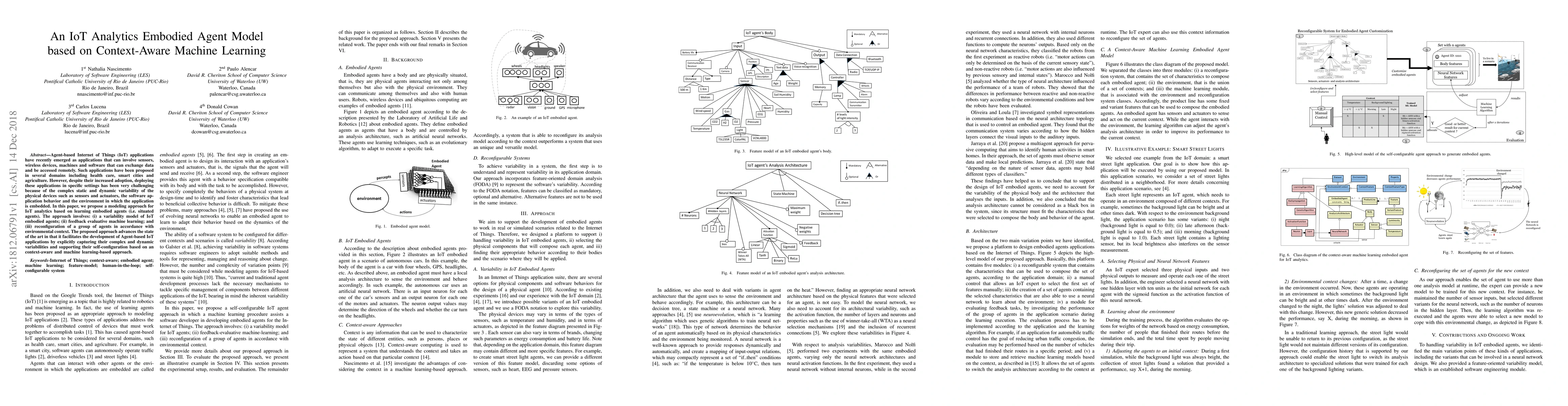 This paper proposes a modeling approach for IoT analytics using context-aware machine learning embodied agents, addressing the challenges of deploying IoT applications by capturing their dynamic variabilities and enabling self-configuration based on environmental context. The method involves a variability model, feedback evaluative machine learning, and adaptive agent reconfiguration.